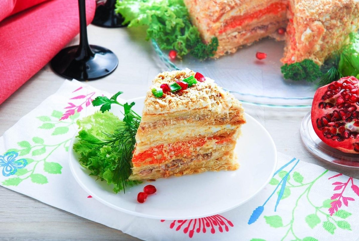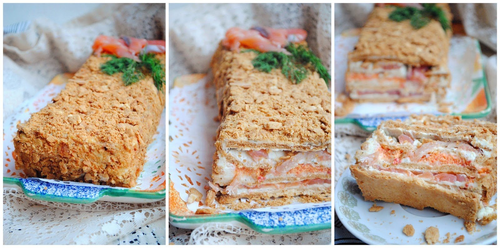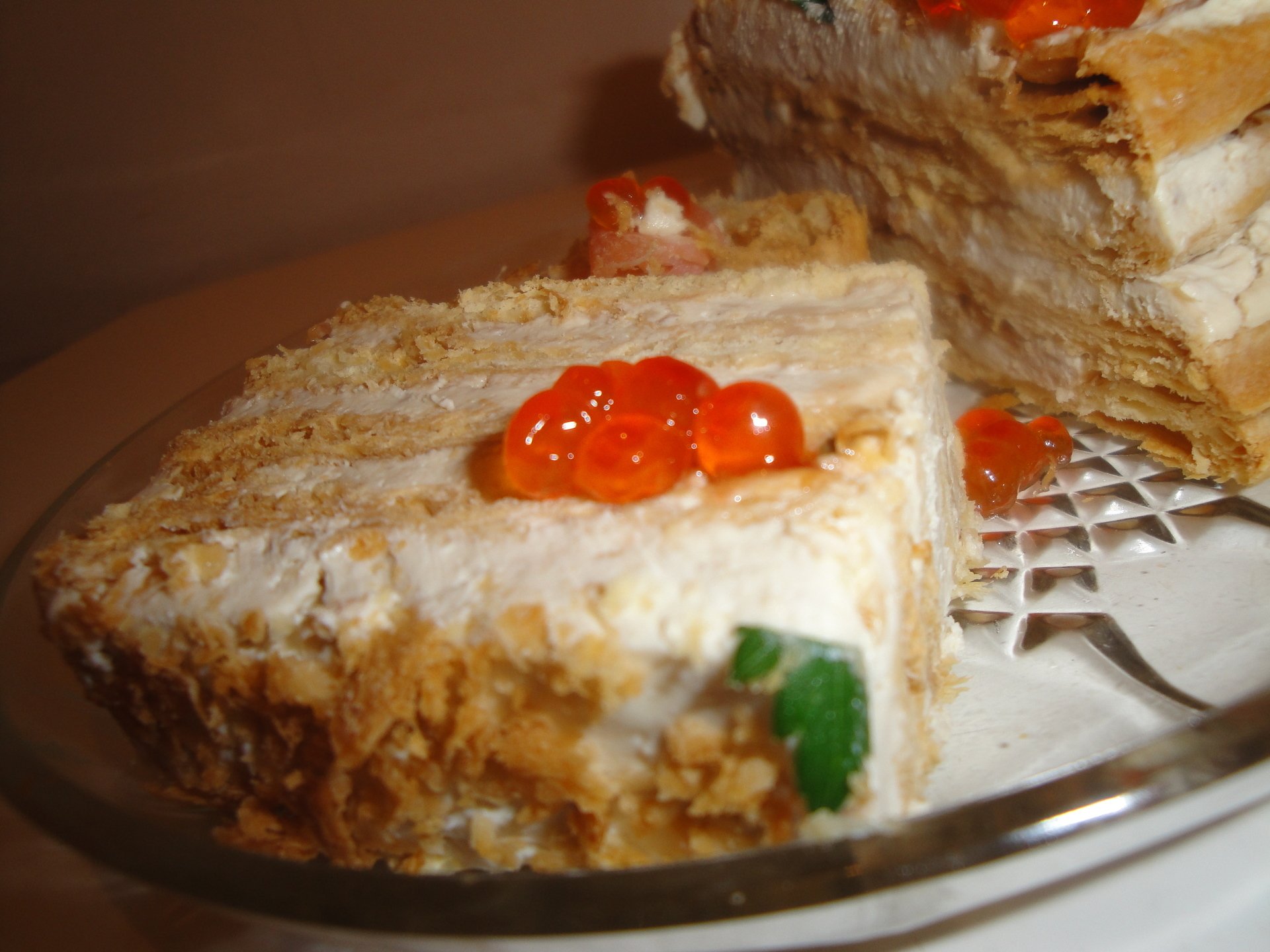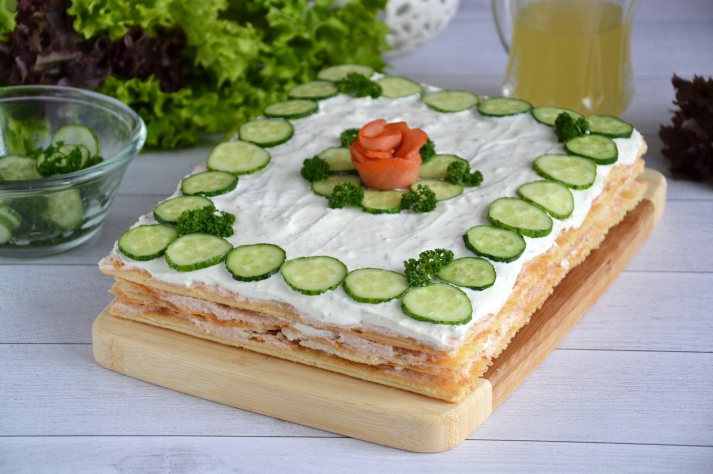 Торт закусочный Наполеон из готовых коржей с красной рыбой