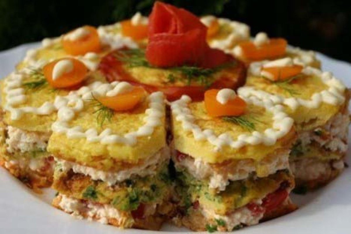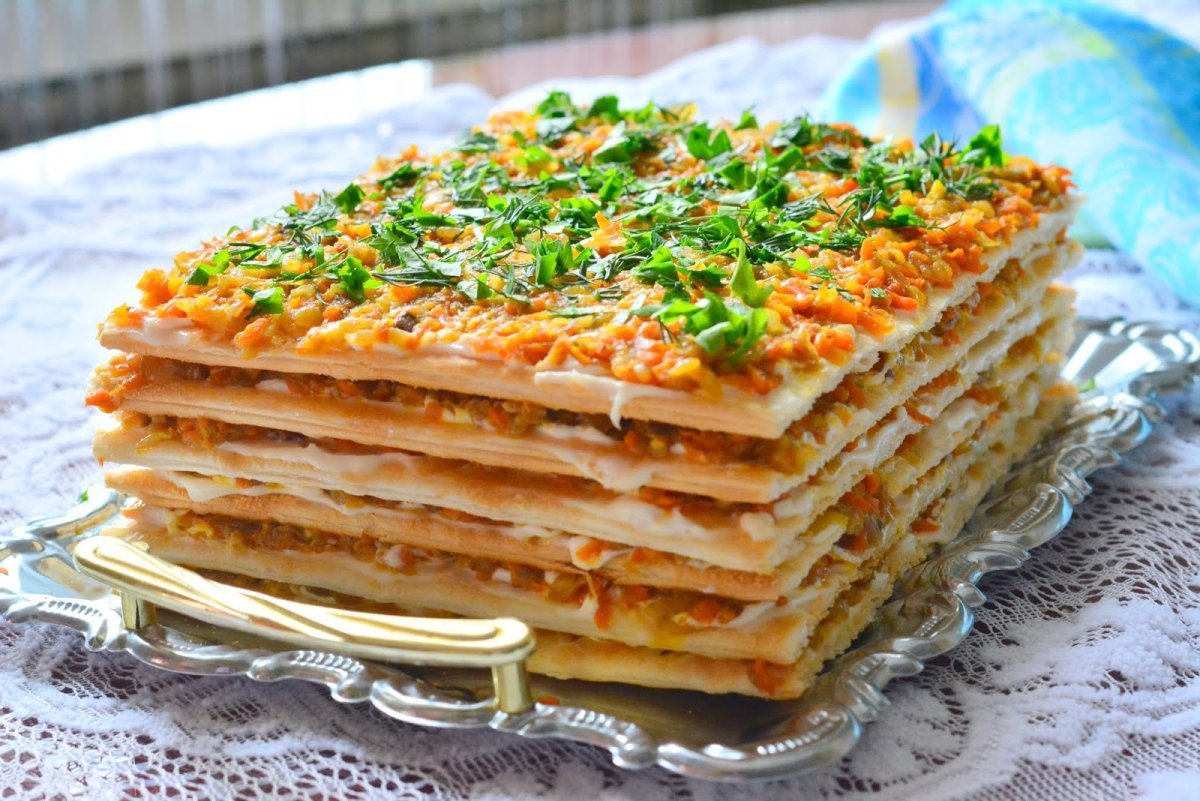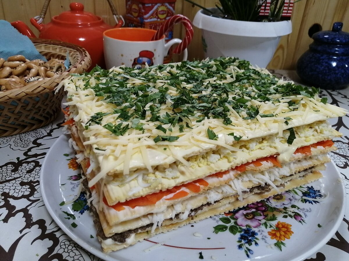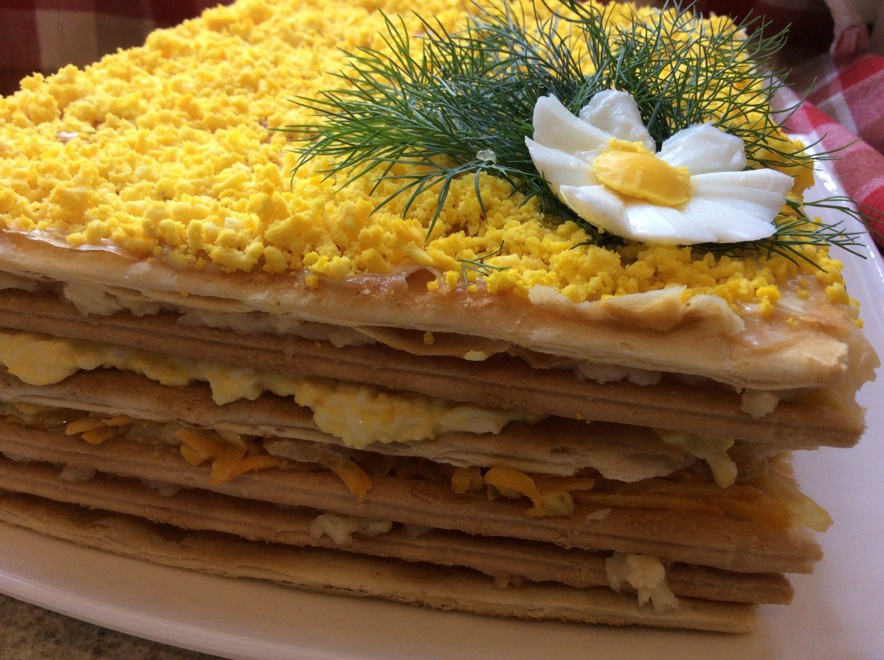 Торт закусочный Наполеон из готовых коржей с красной рыбой