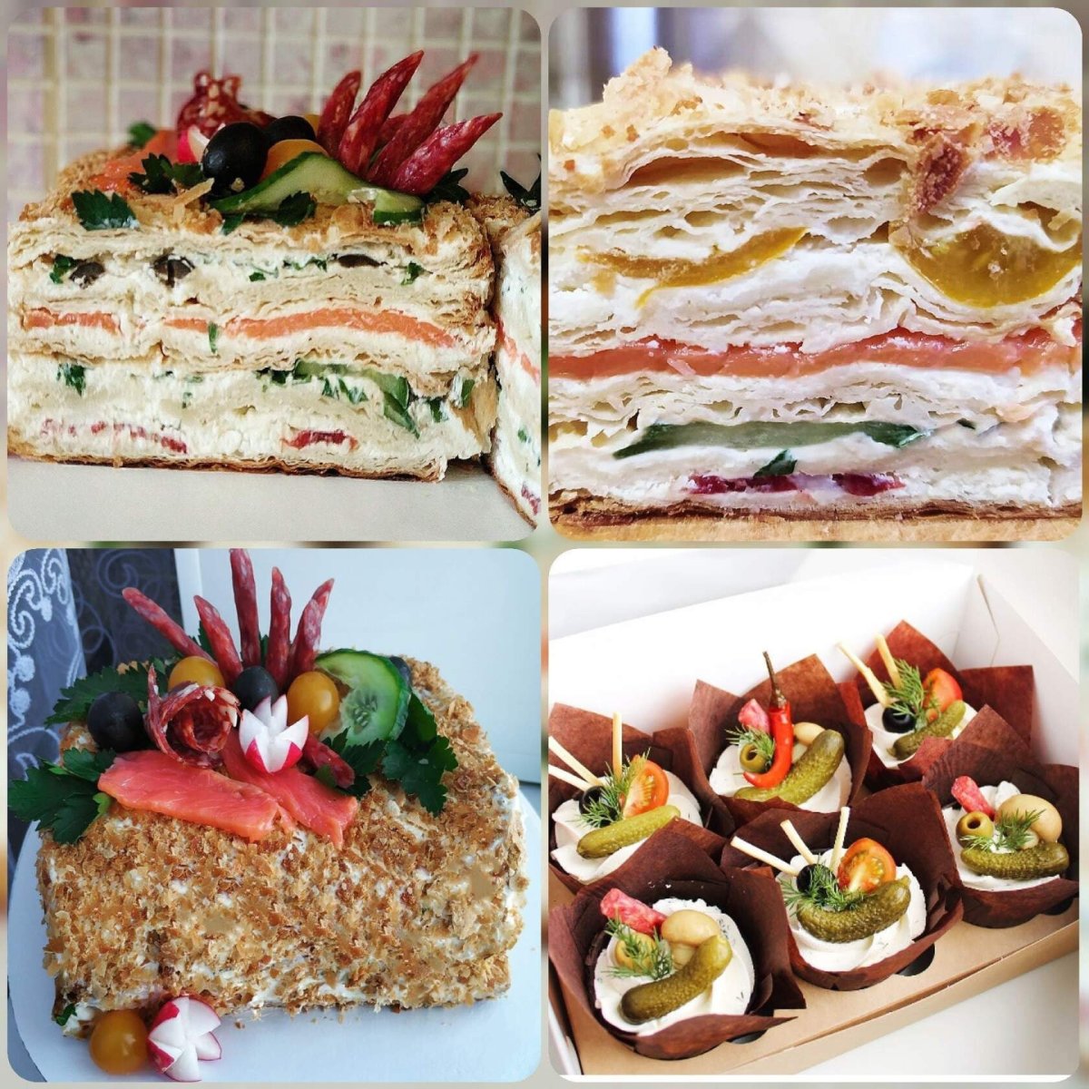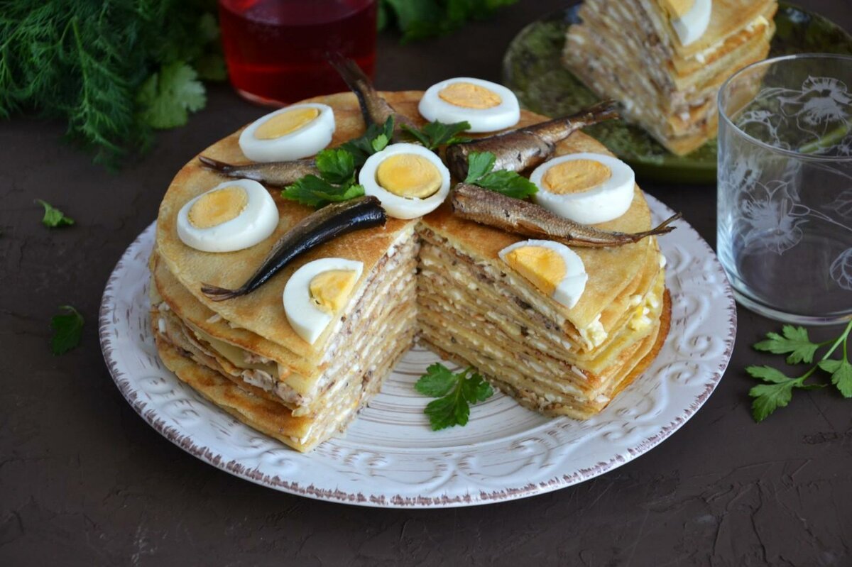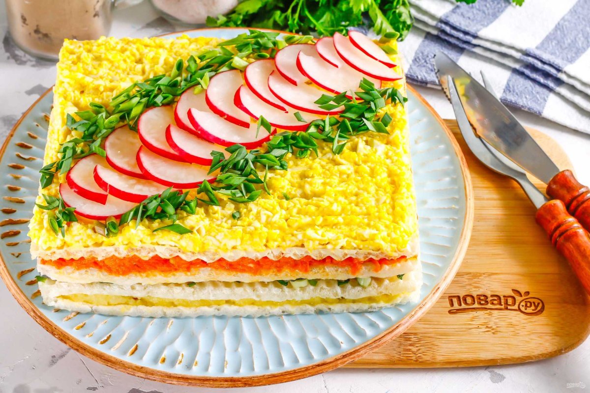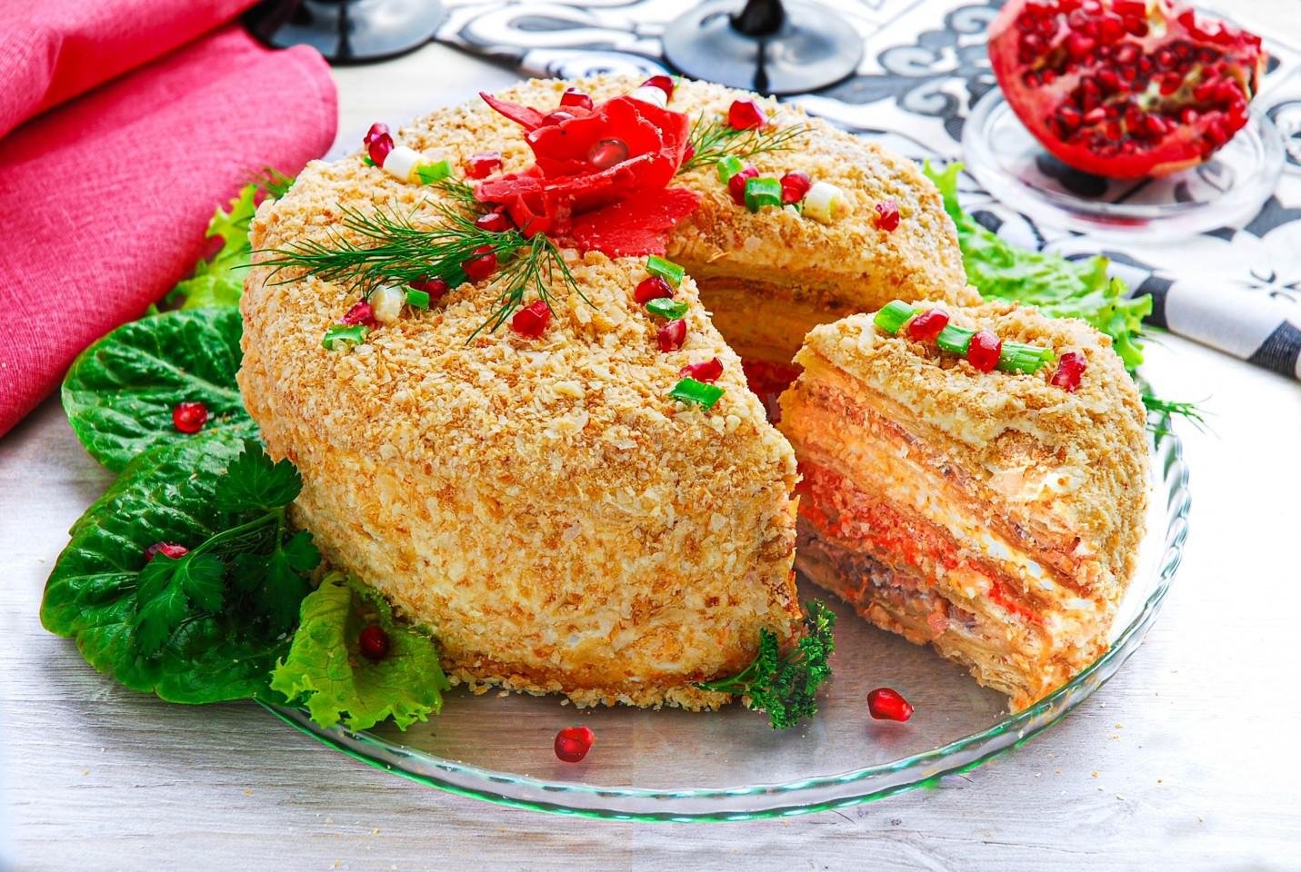 Торт закусочный Наполеон из готовых коржей с красной рыбой
