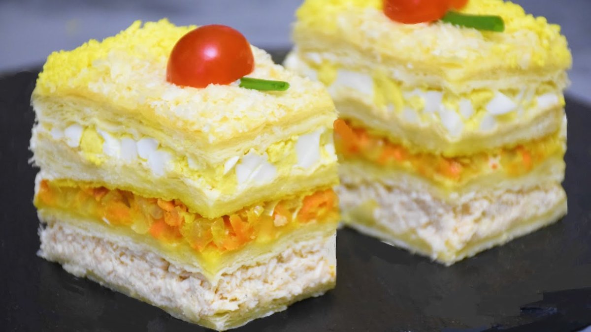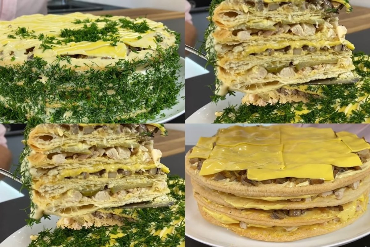 Закусочный торт Наполеон с курицей и грибами из готовых коржей