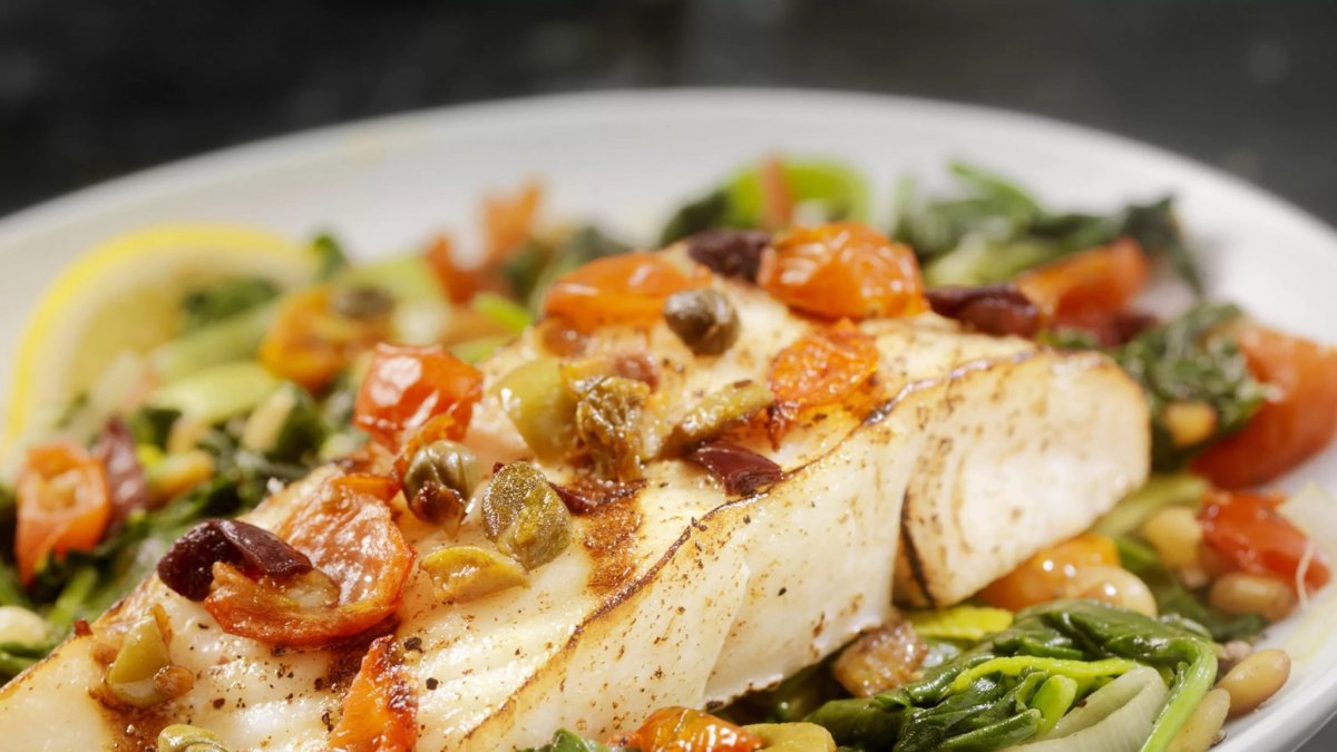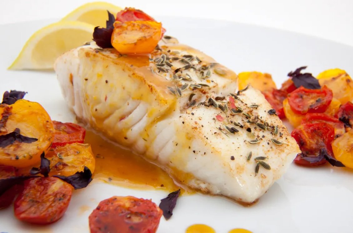 Палтус с томатами черри