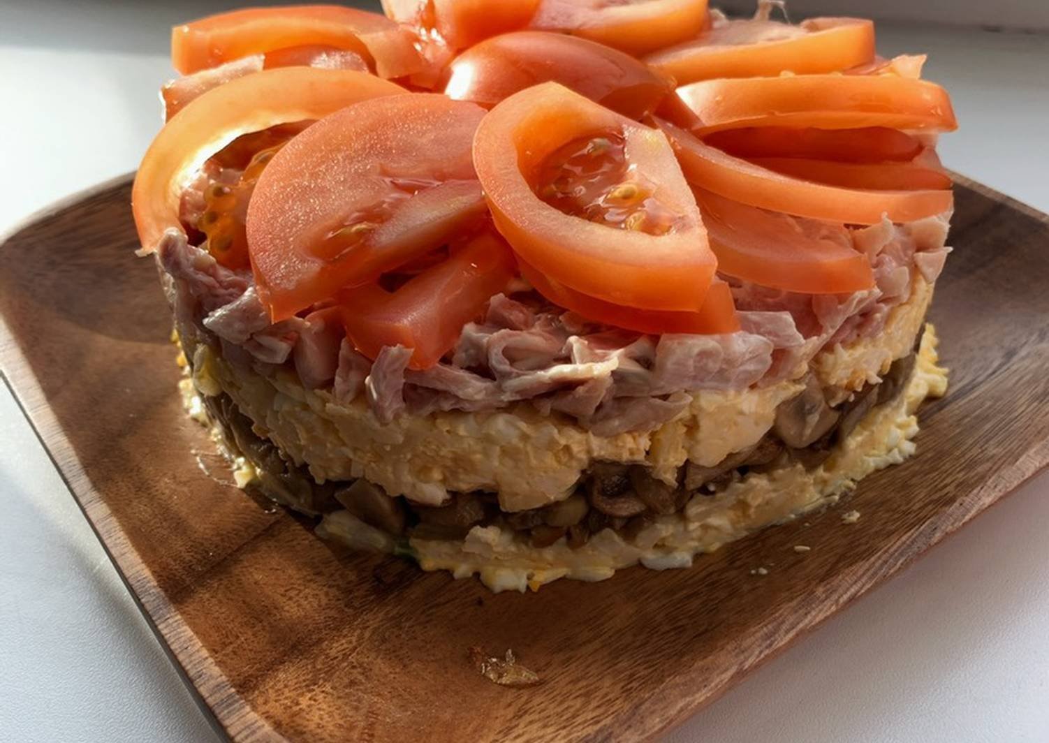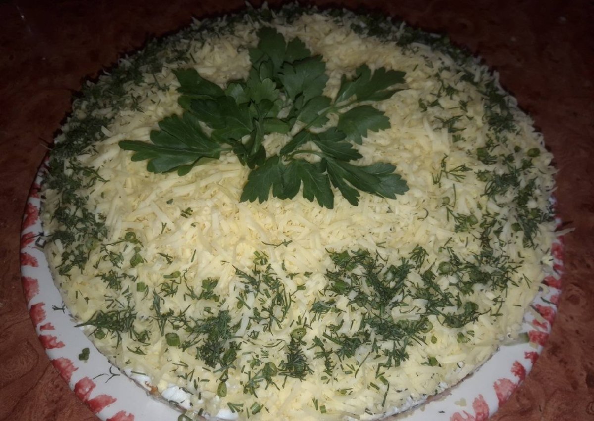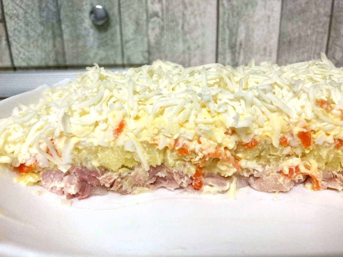 Слоёный салат с копчёной курицей