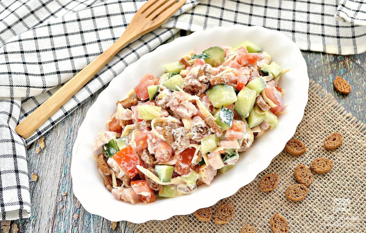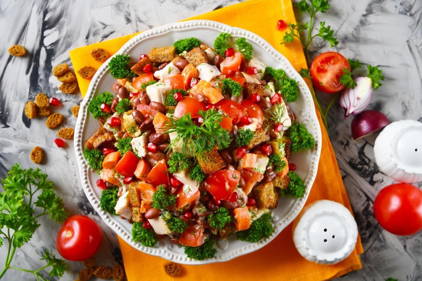 Сад с копченой грудкой помидорами и сухариками