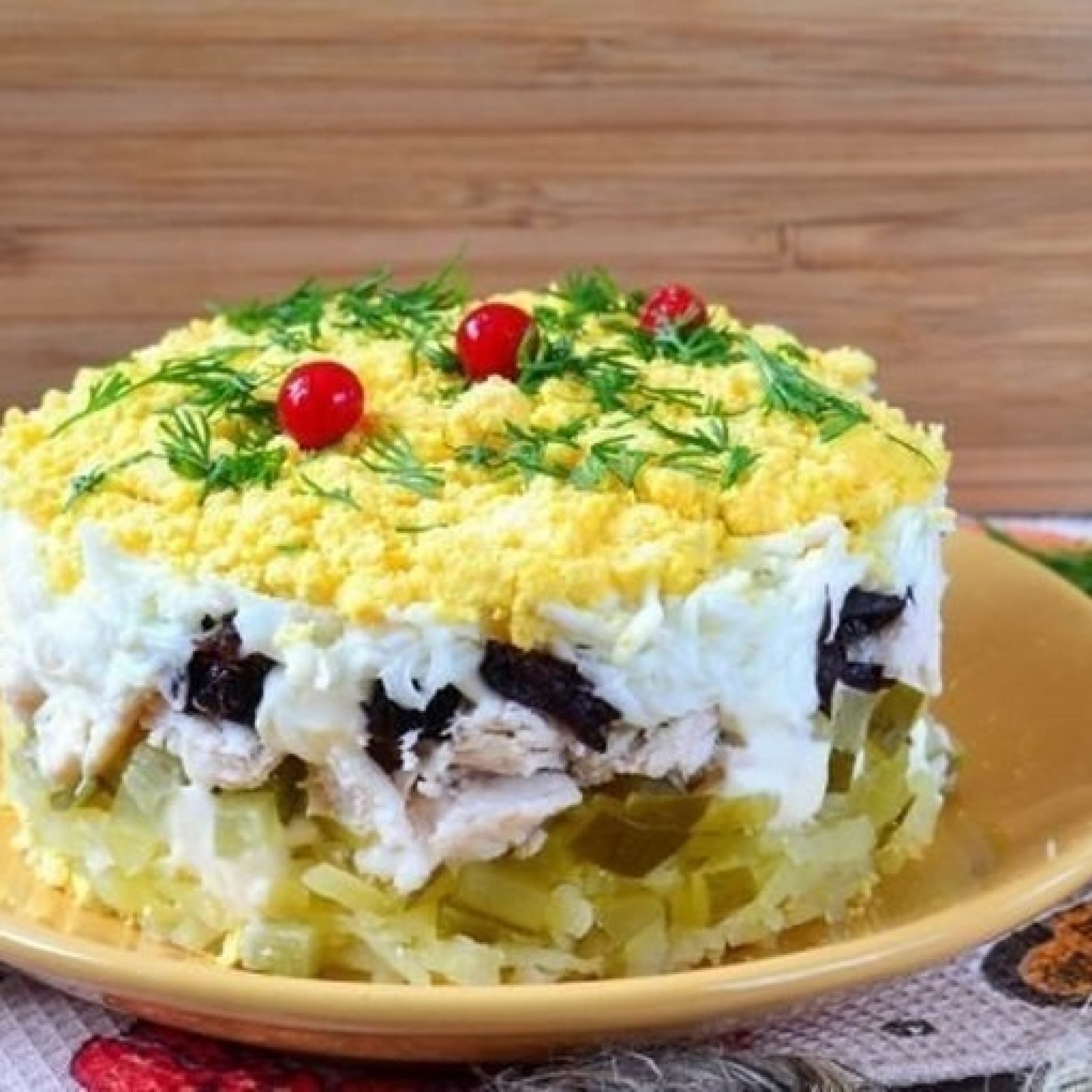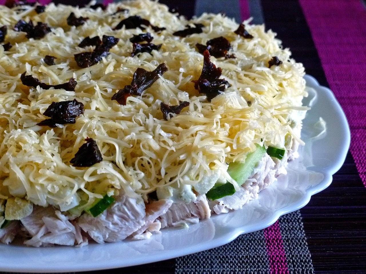 Салат с курицей и черносливом слоеный
