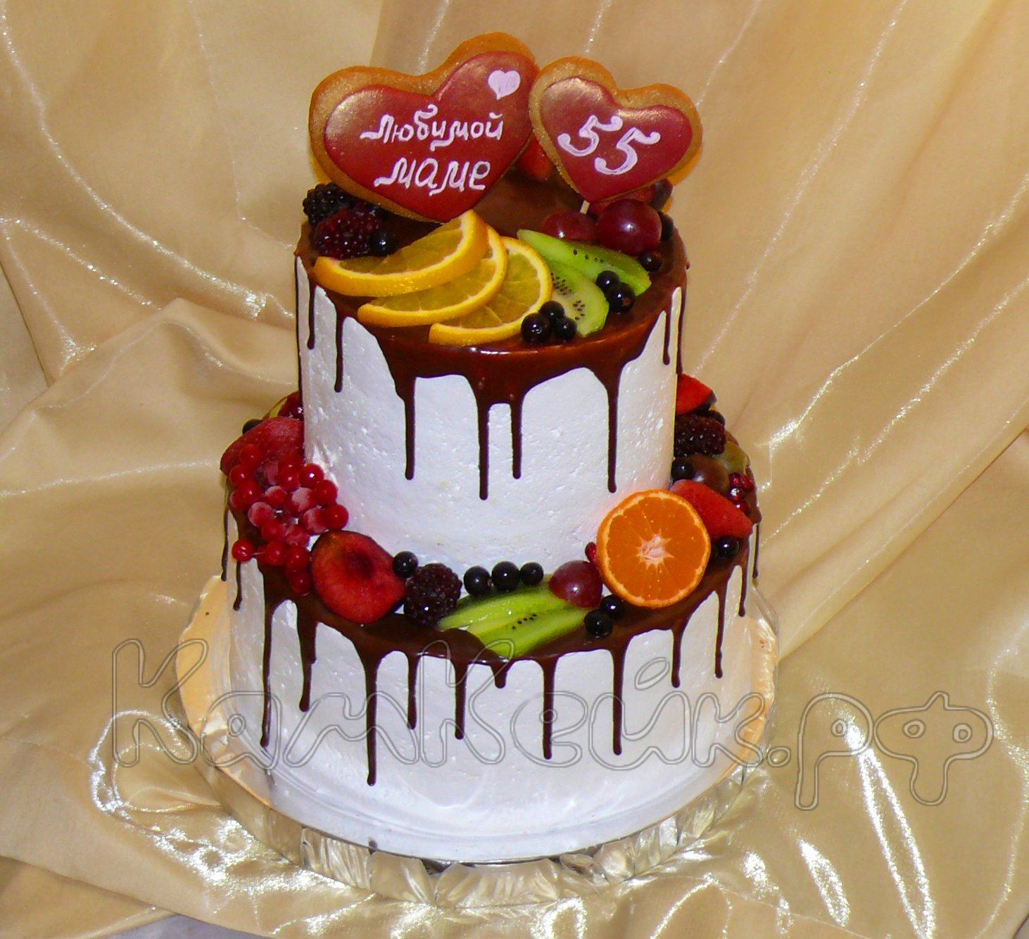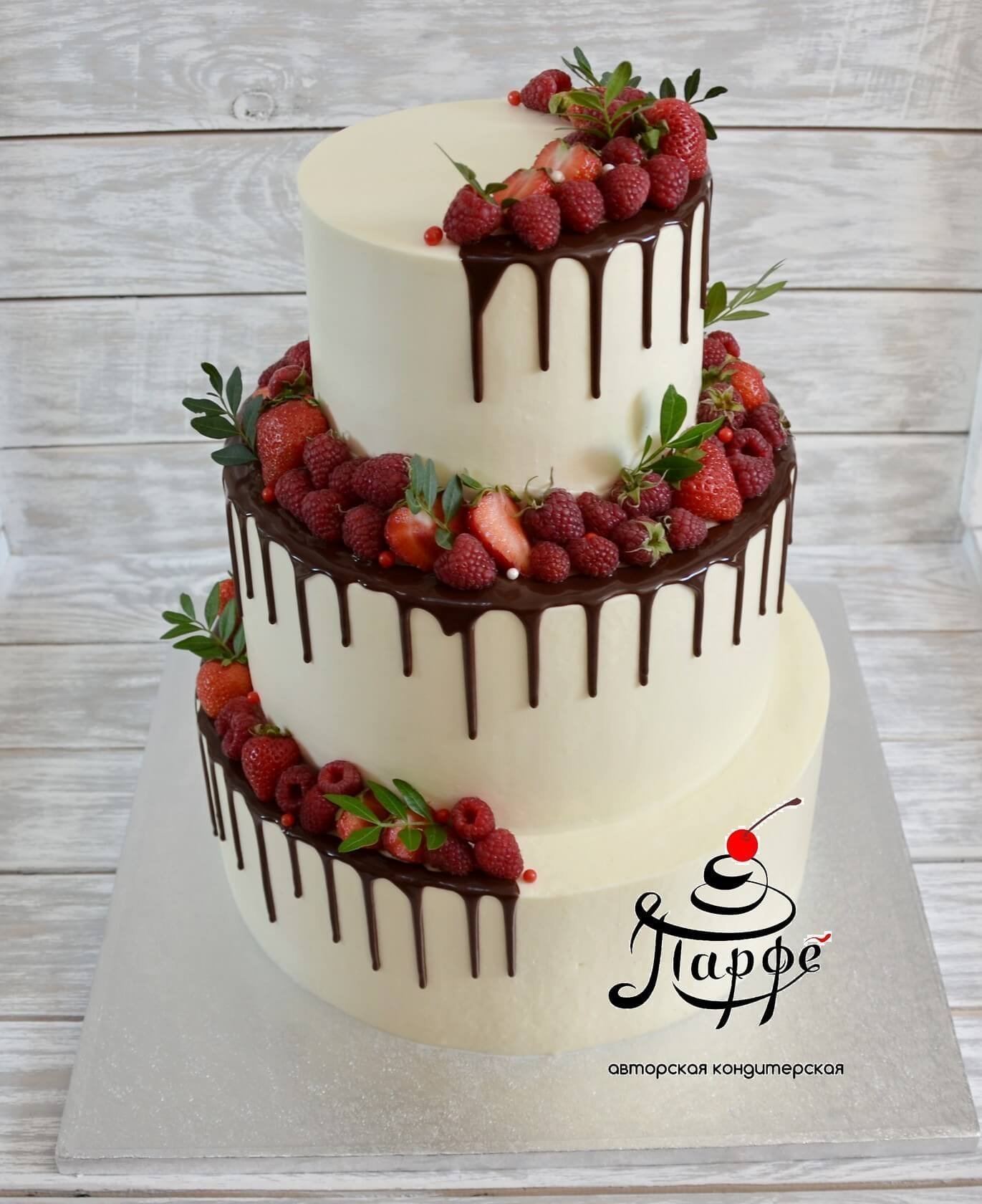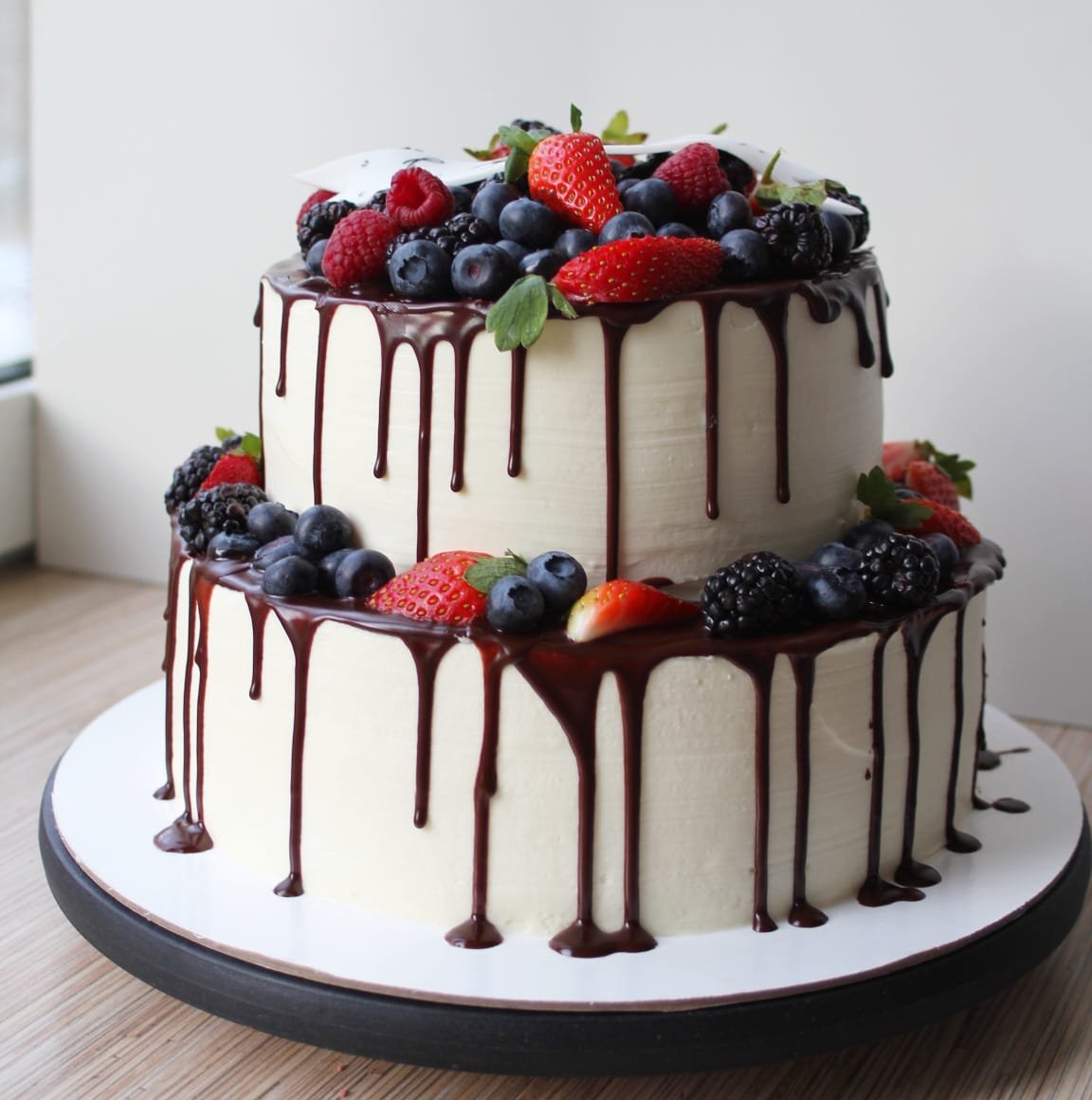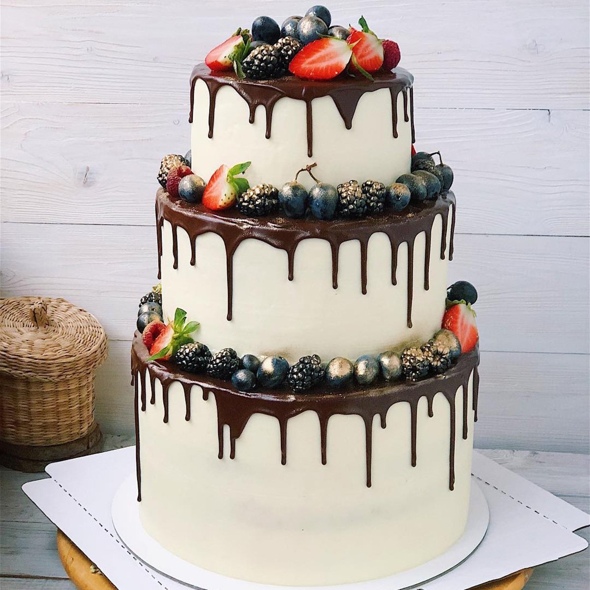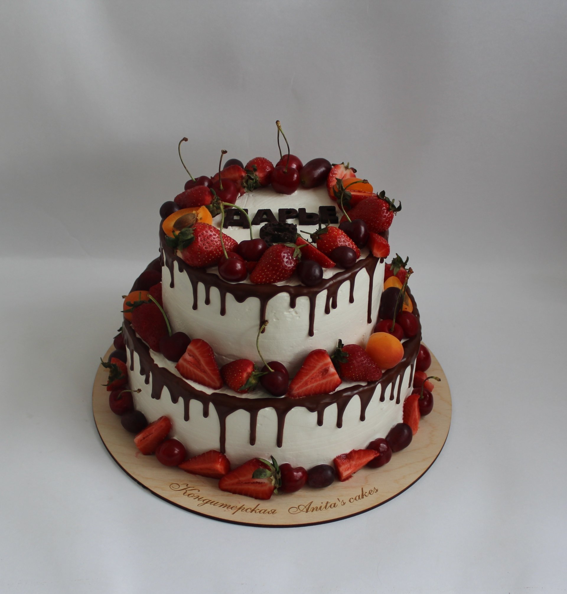 2 Ярусный торт с ягодами и шоколадными подтеками и фруктами