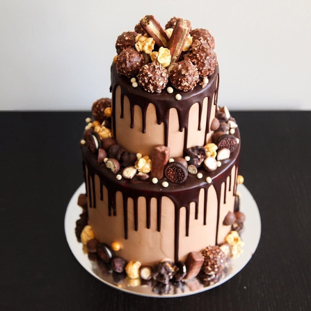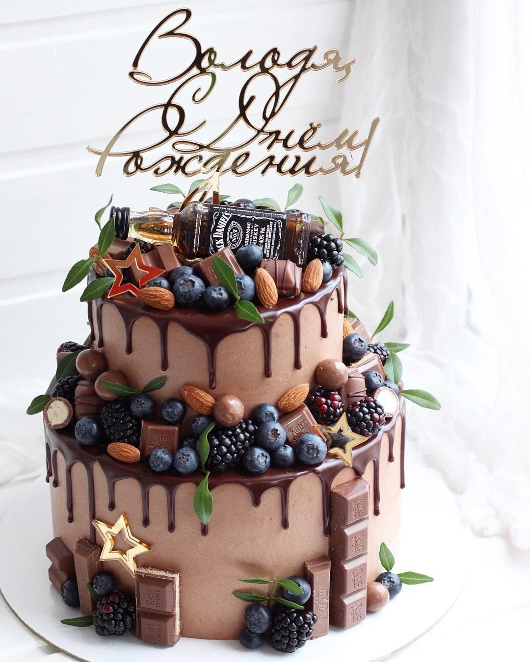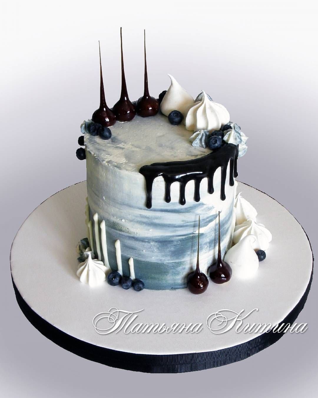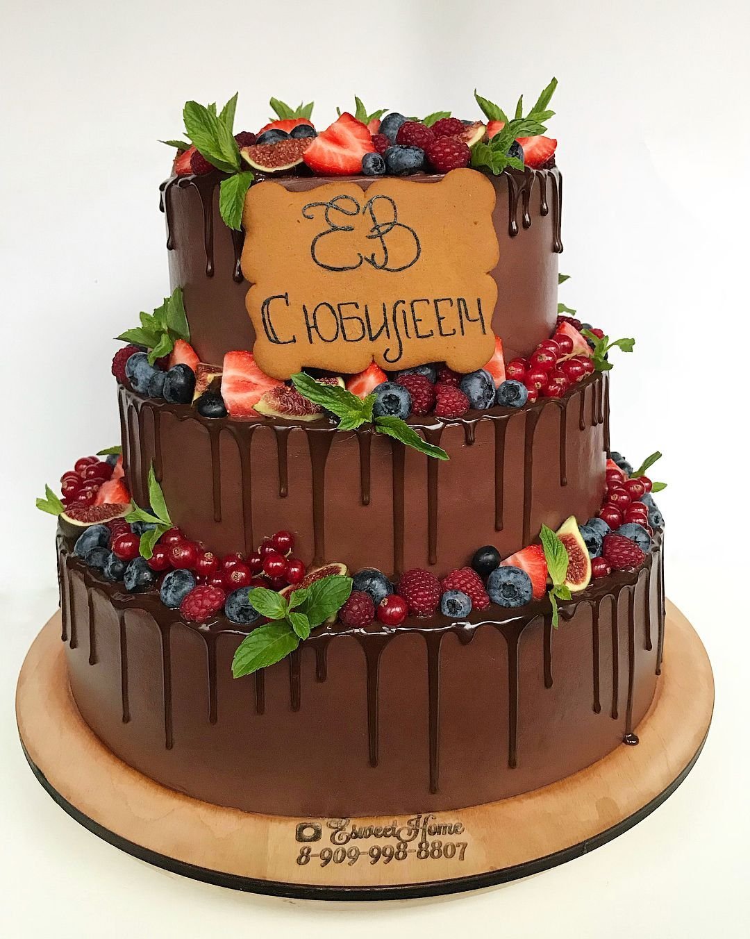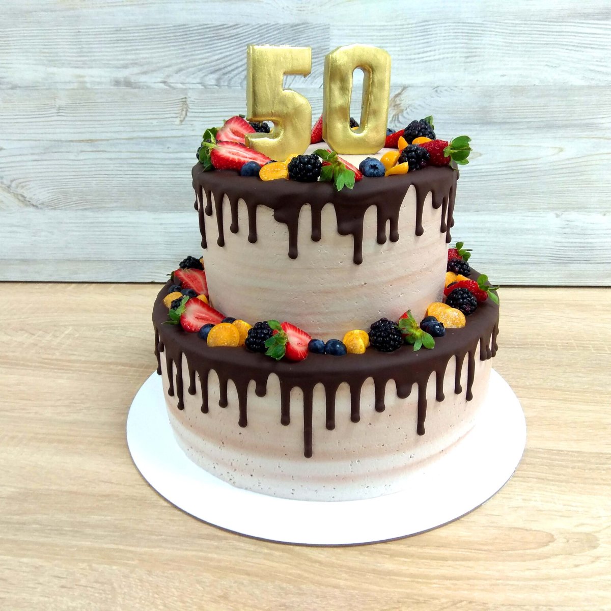 2 Ярусный торт с ягодами и шоколадными подтеками и фруктами