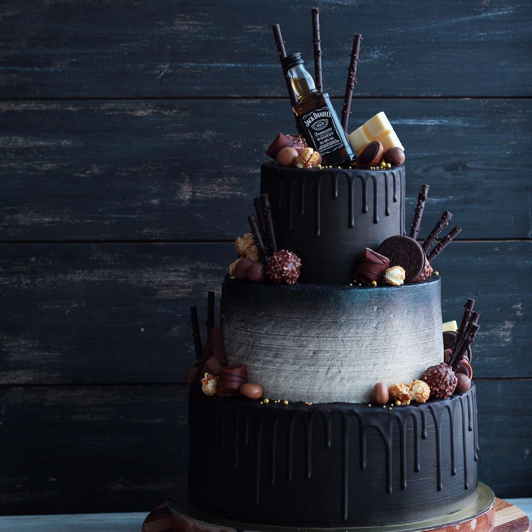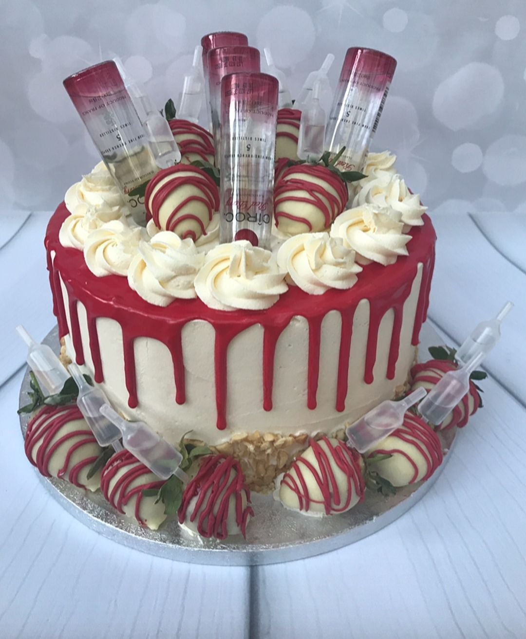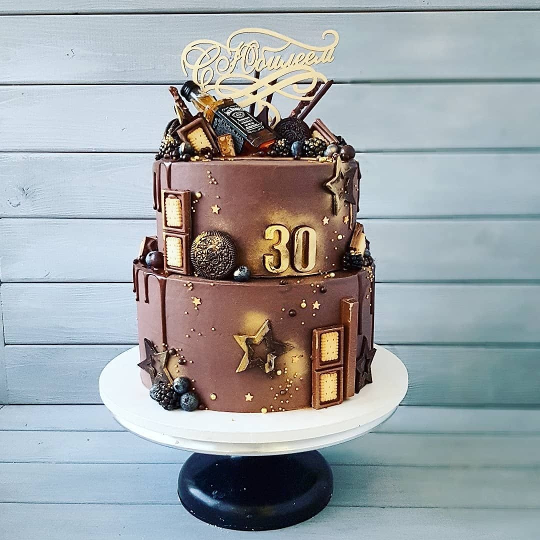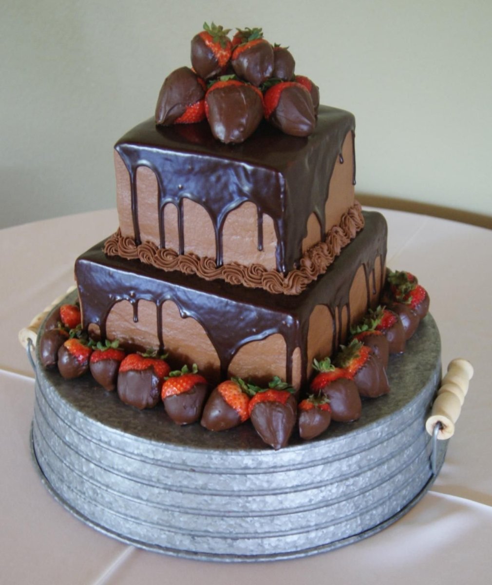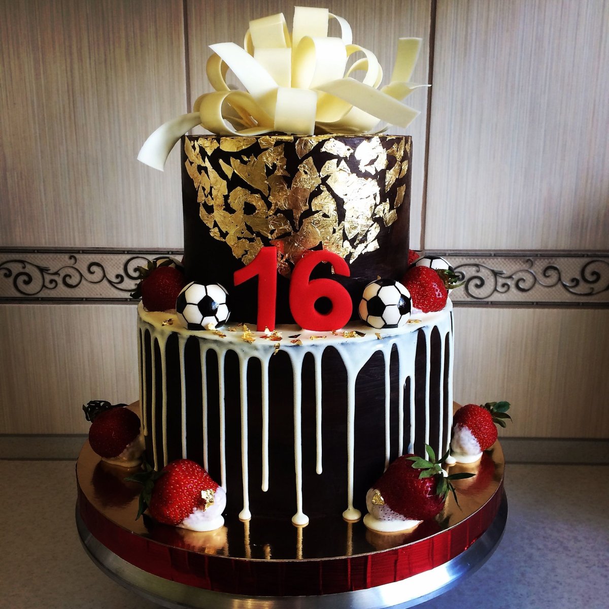 2 Ярусный торт с ягодами и шоколадными подтеками и фруктами