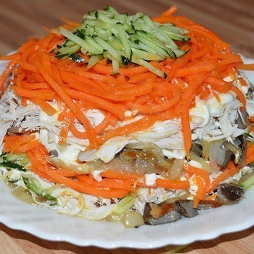 Салат Лисичка с корейской морковкой и курицей