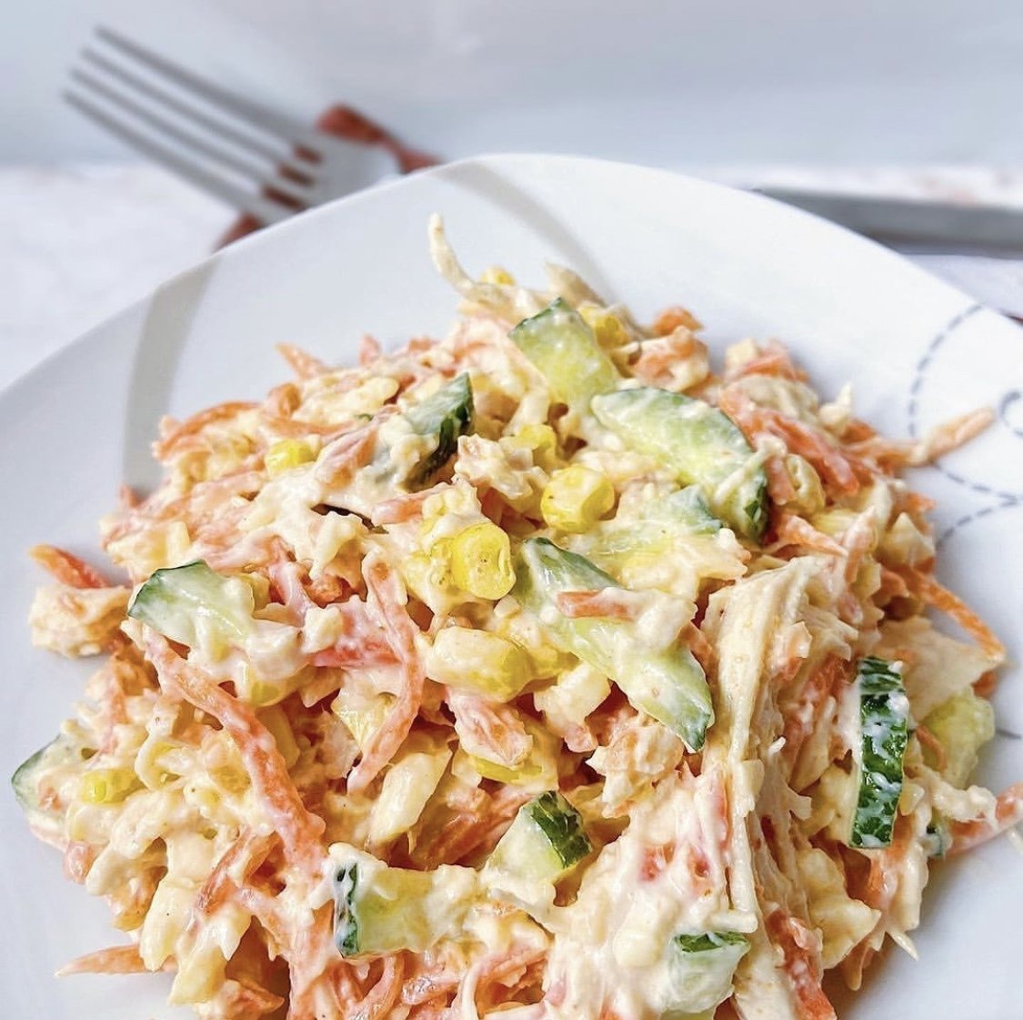 Салат с корейской морковью и курицей и кукурузой и огурцом