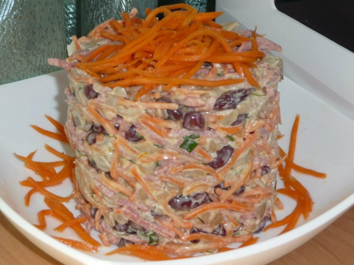 Салат из копчёной курицы с корейской морковкой и фасолью