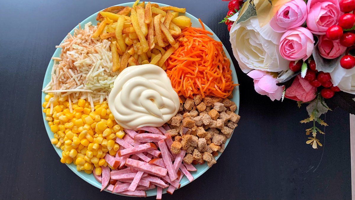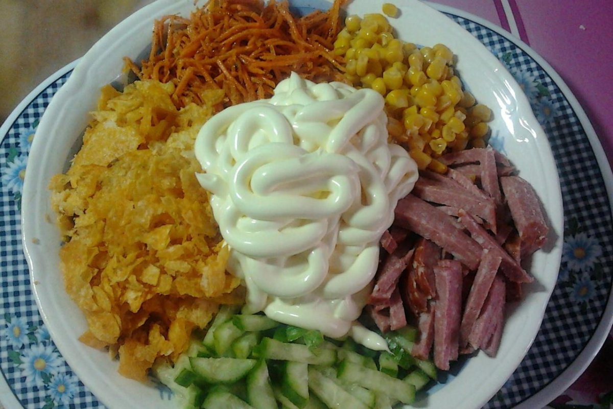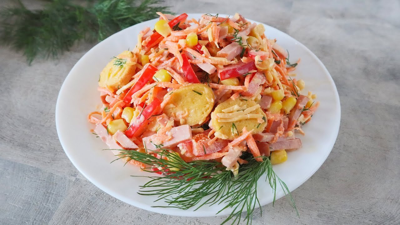 Салат кукуруза корейская морковь копченая колбаса сухарики