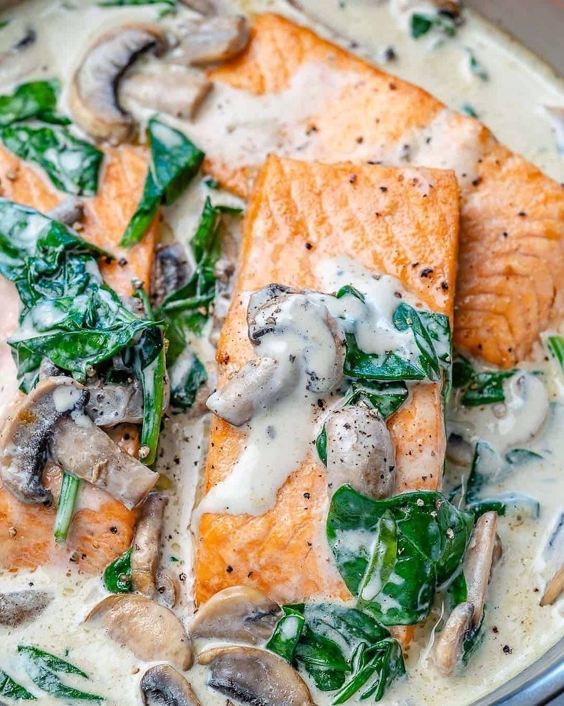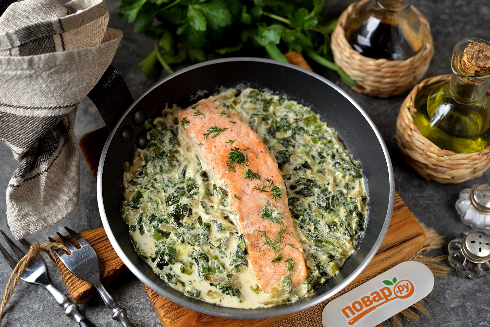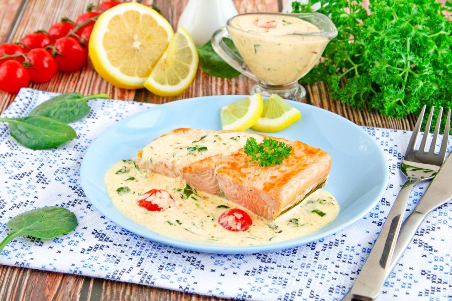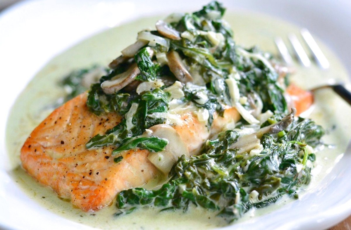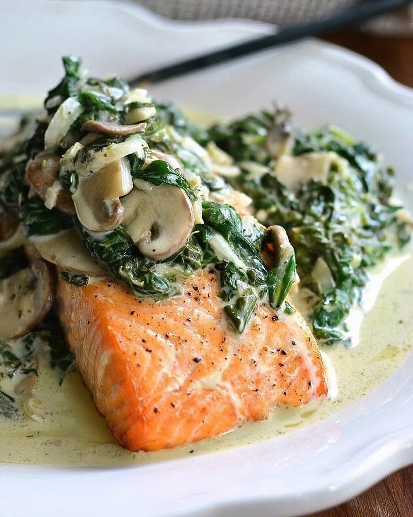 Филе лосося в сливочном соусе со шпинатом и грибами