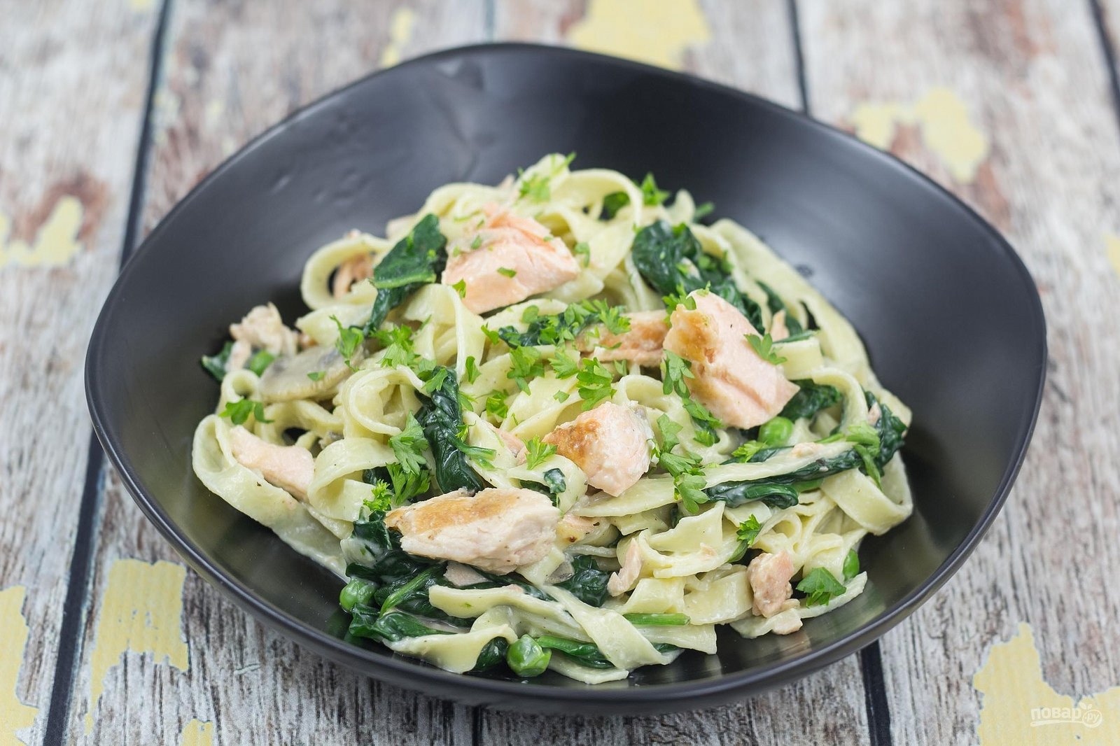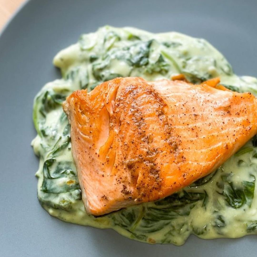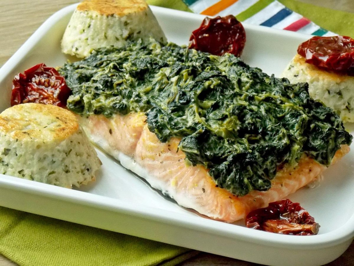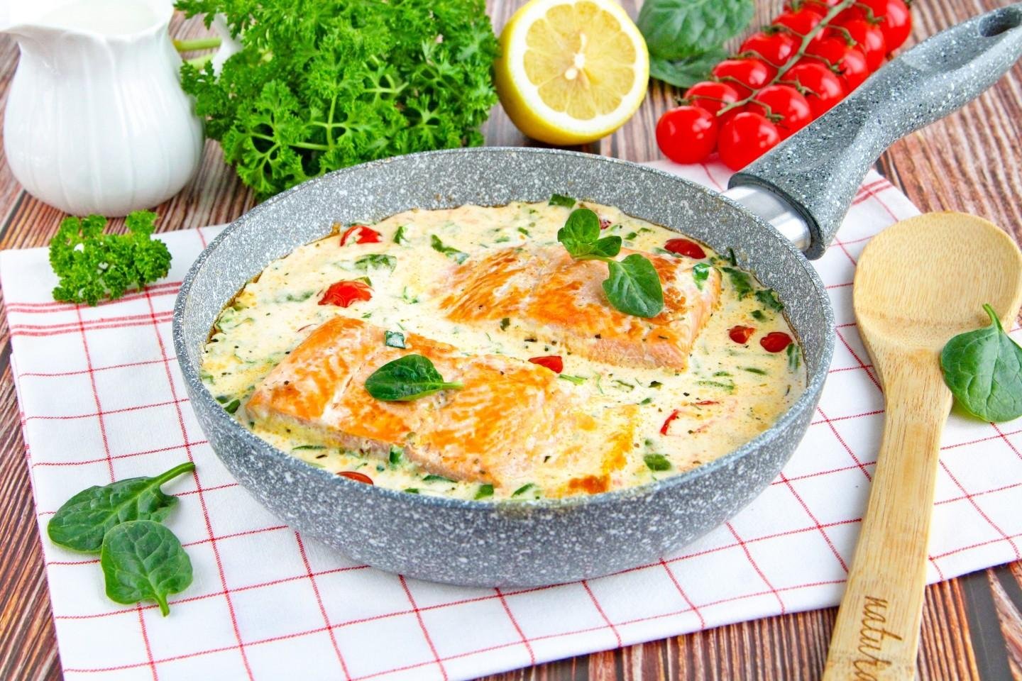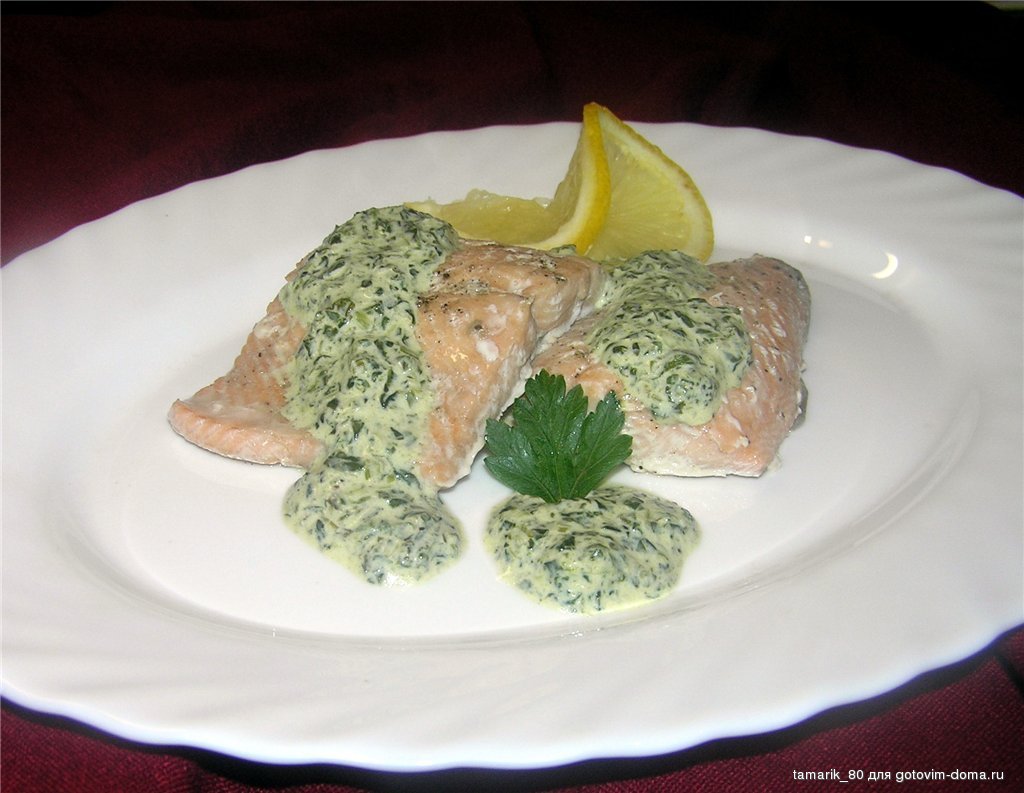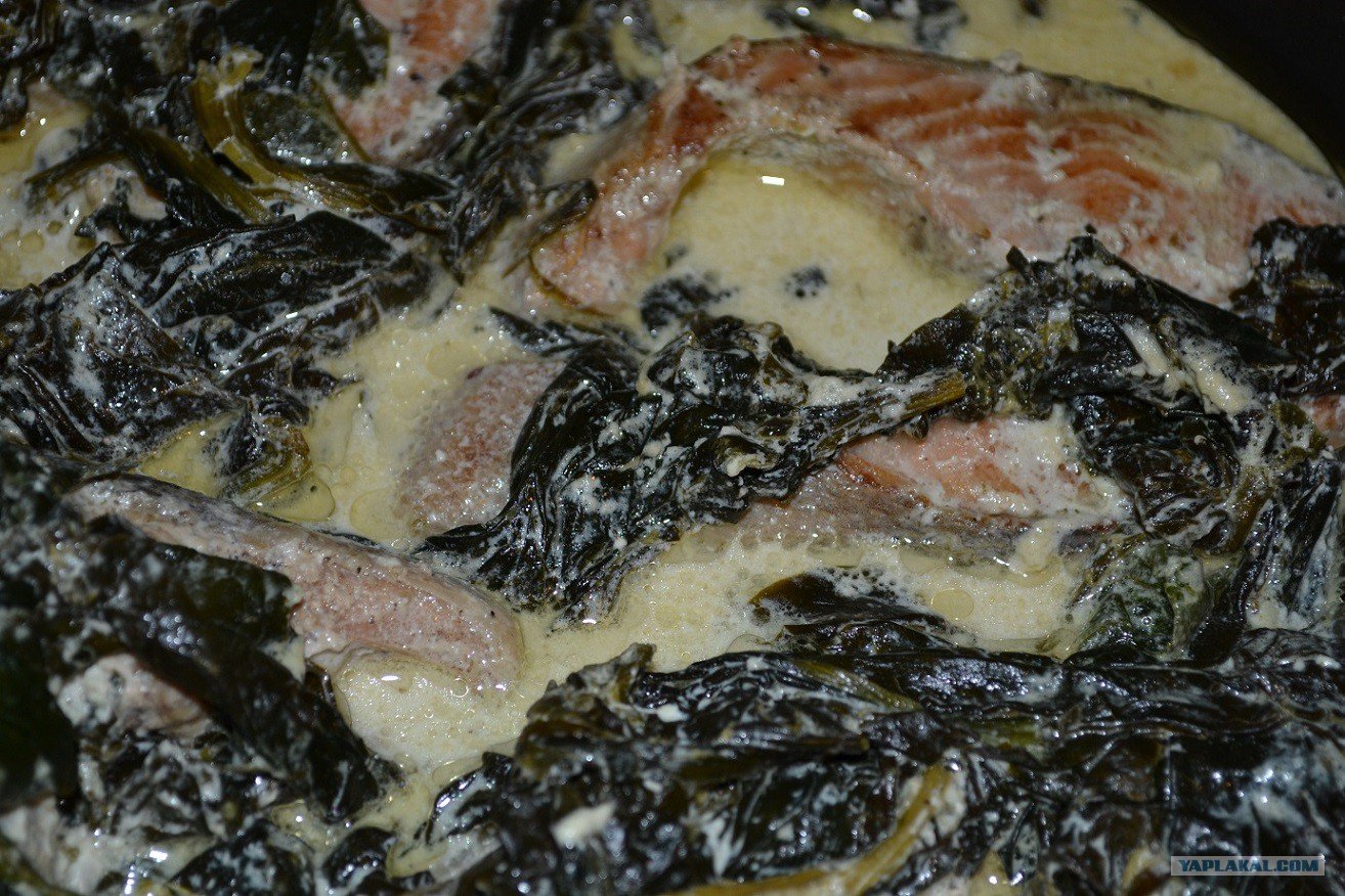 Филе лосося в сливочном соусе со шпинатом и грибами