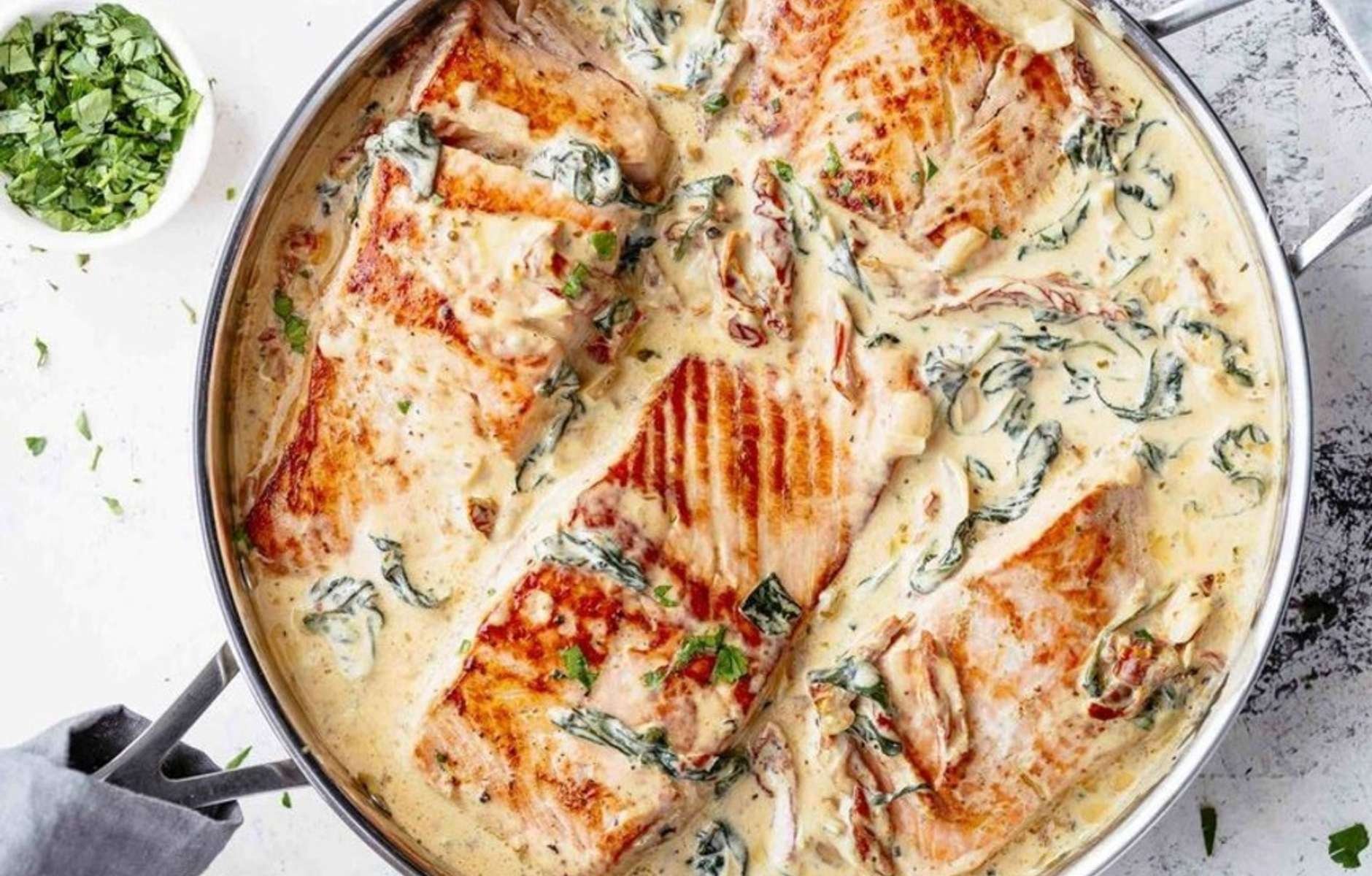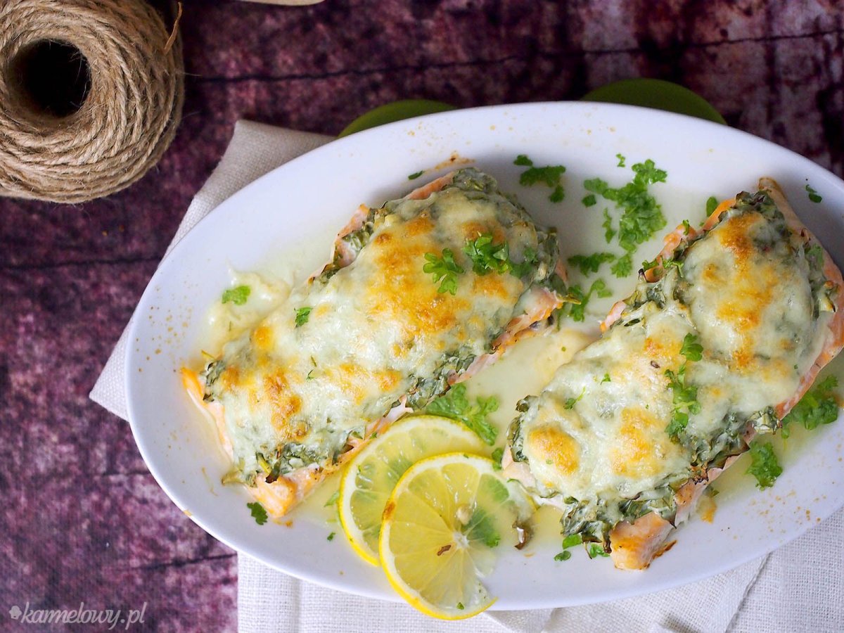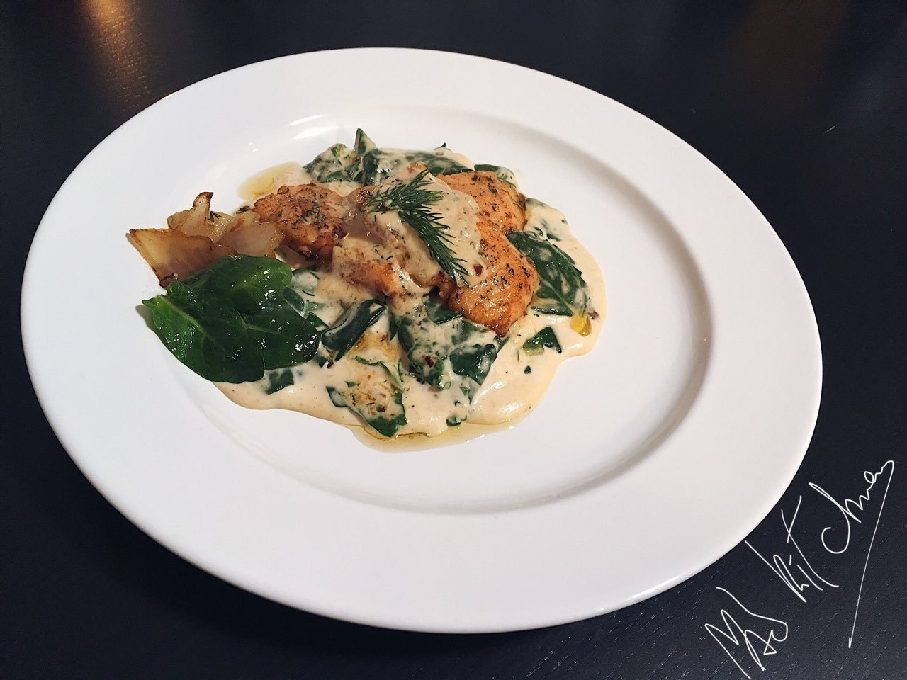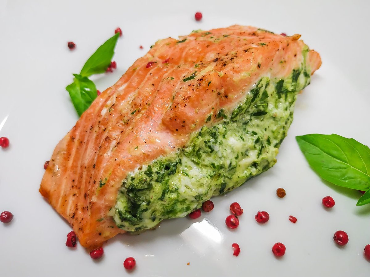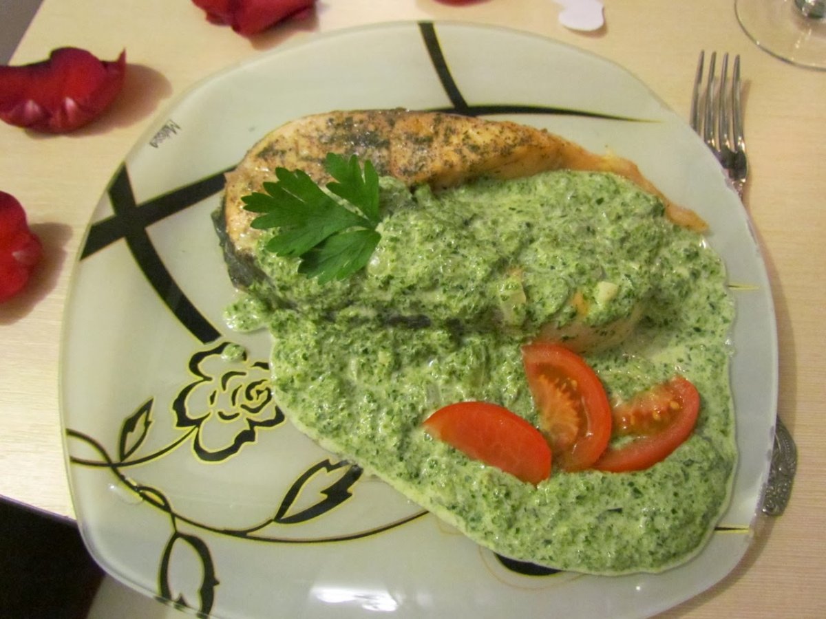 Филе лосося в сливочном соусе со шпинатом и грибами