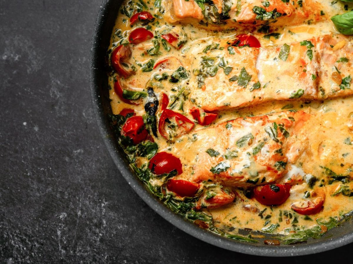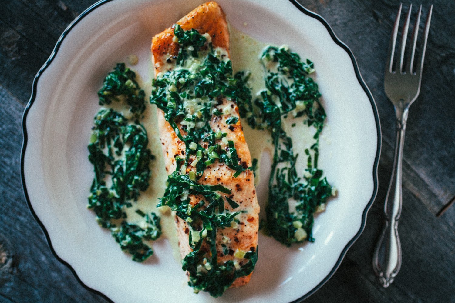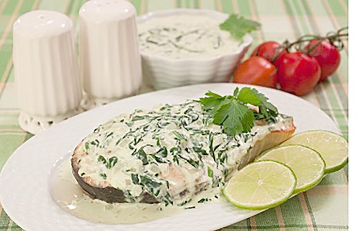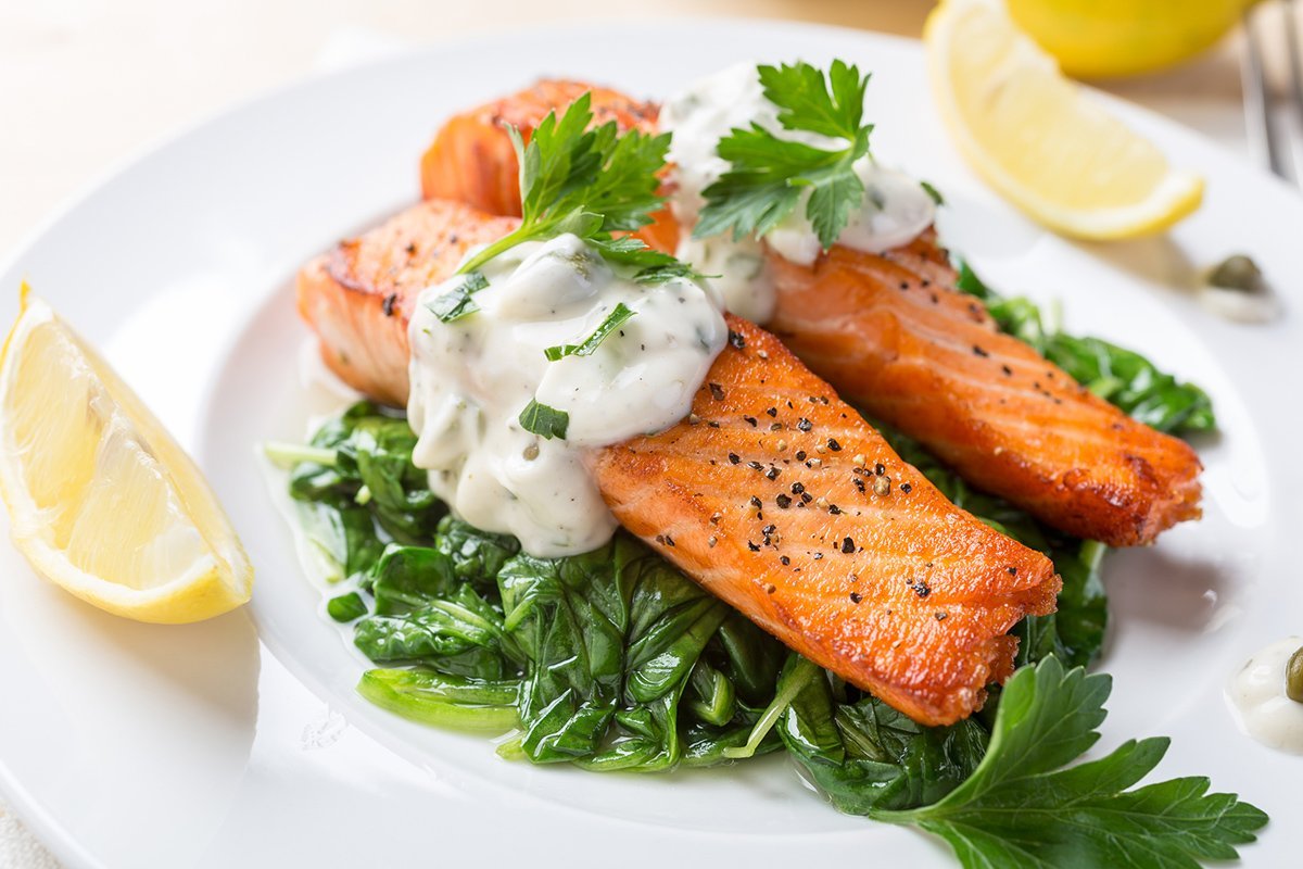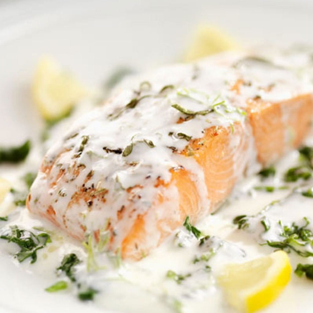 Филе лосося в сливочном соусе со шпинатом и грибами