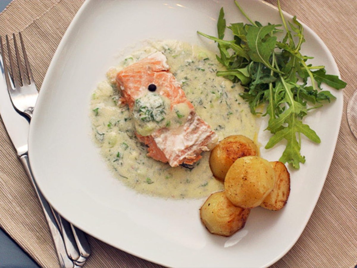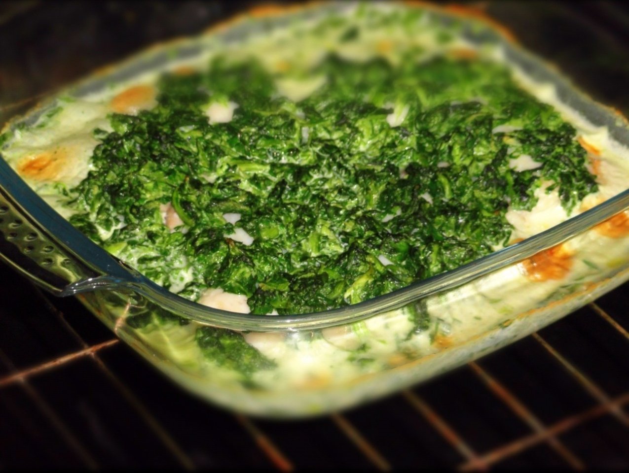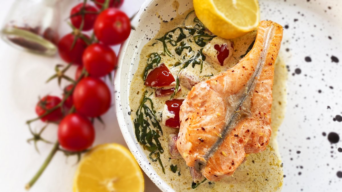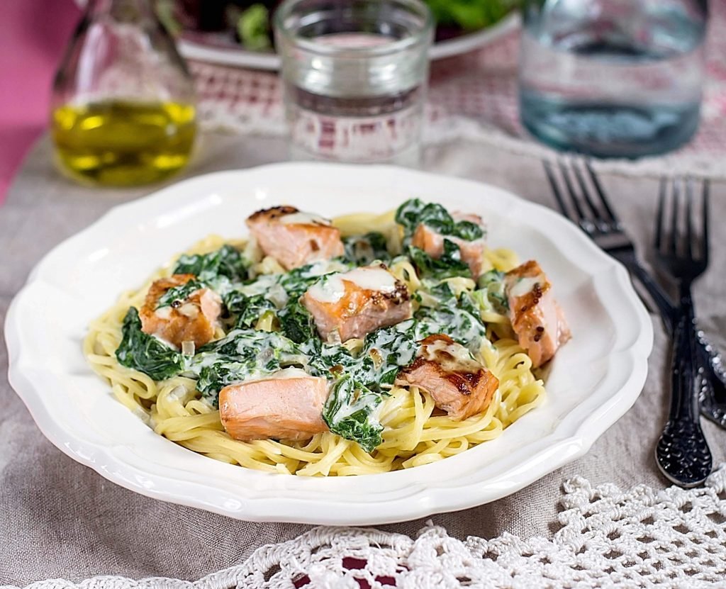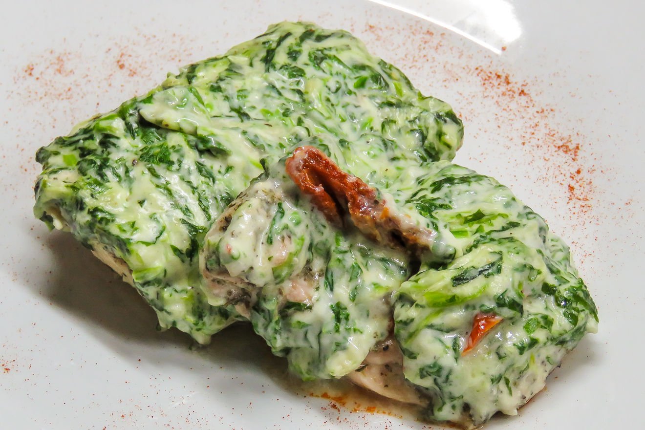 Филе лосося в сливочном соусе со шпинатом и грибами