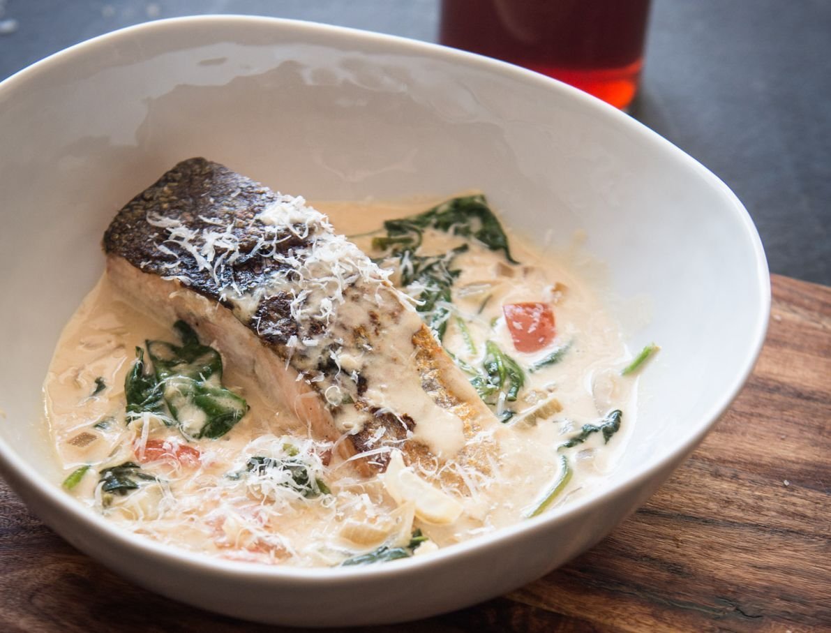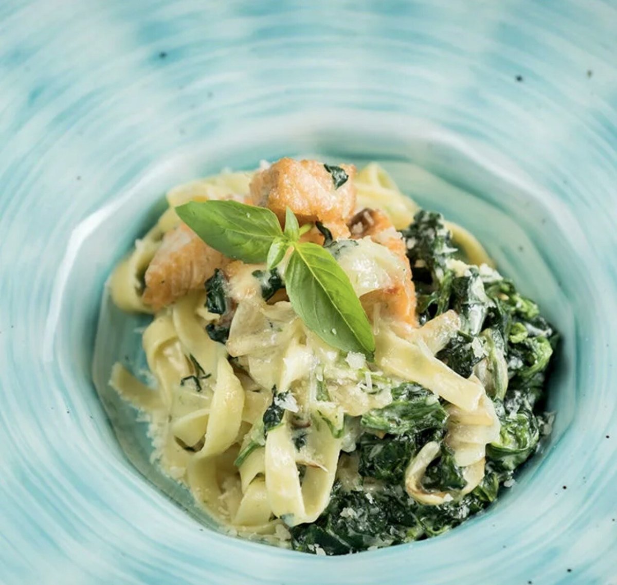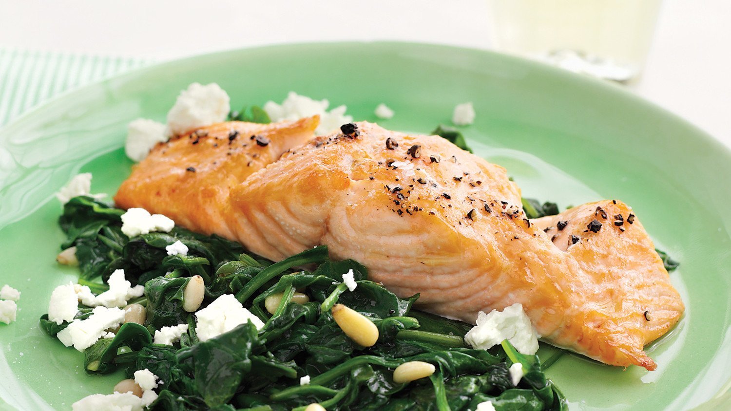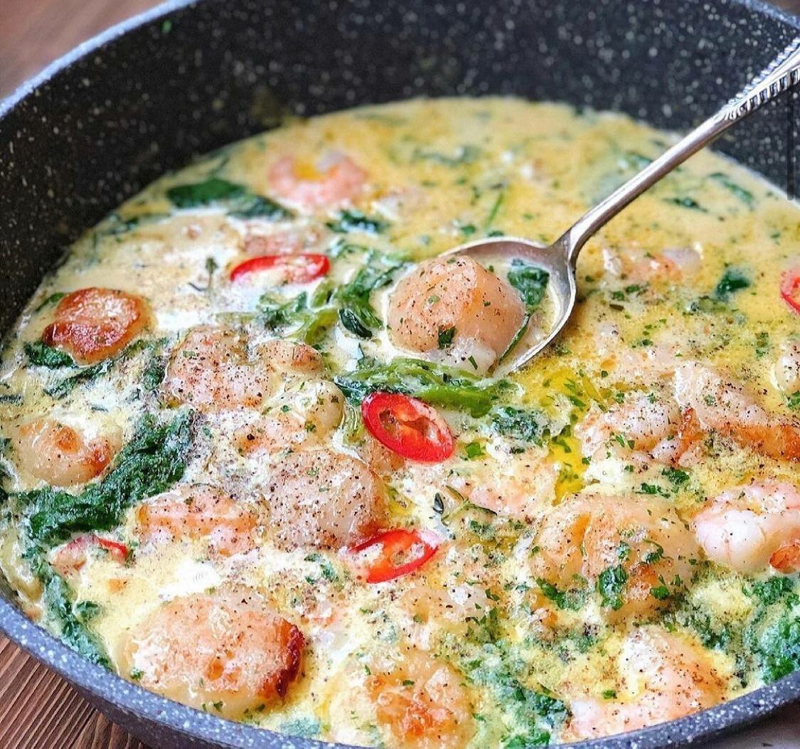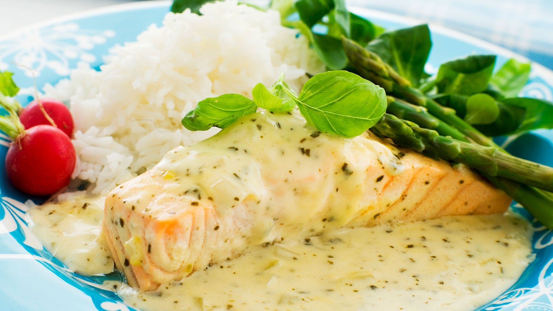 Филе лосося в сливочном соусе со шпинатом и грибами