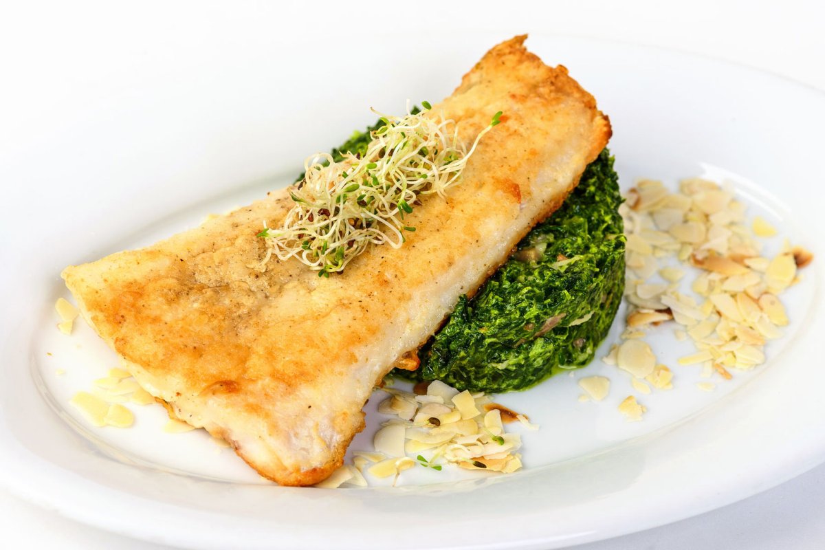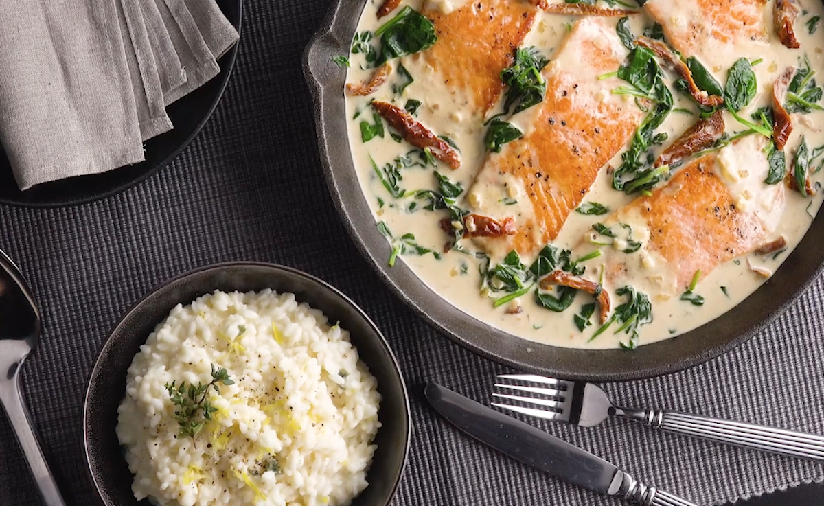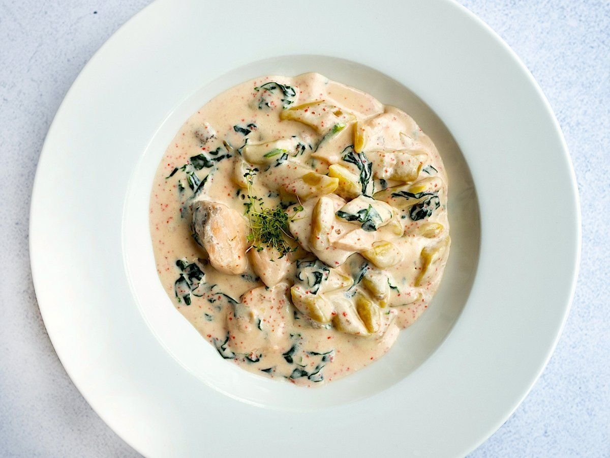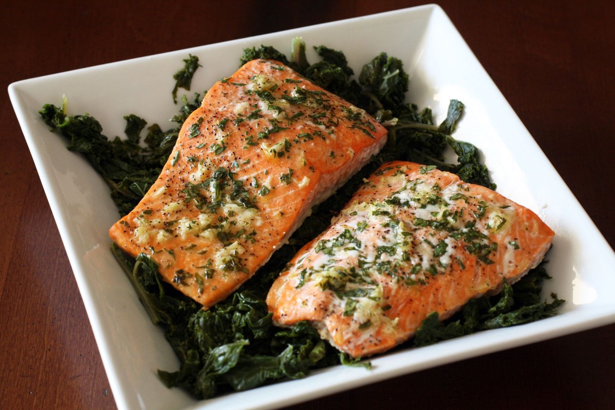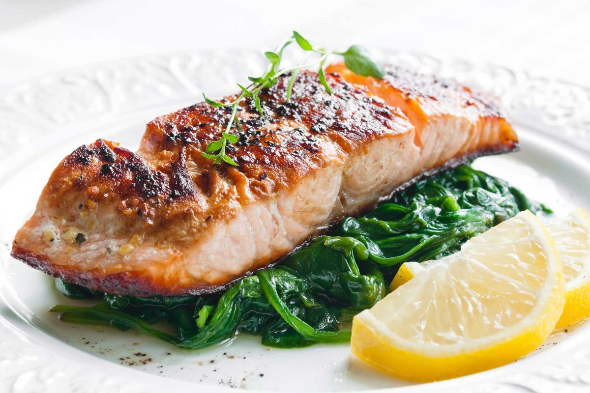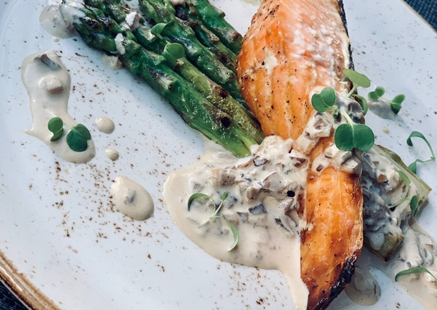 Филе лосося в сливочном соусе со шпинатом и грибами