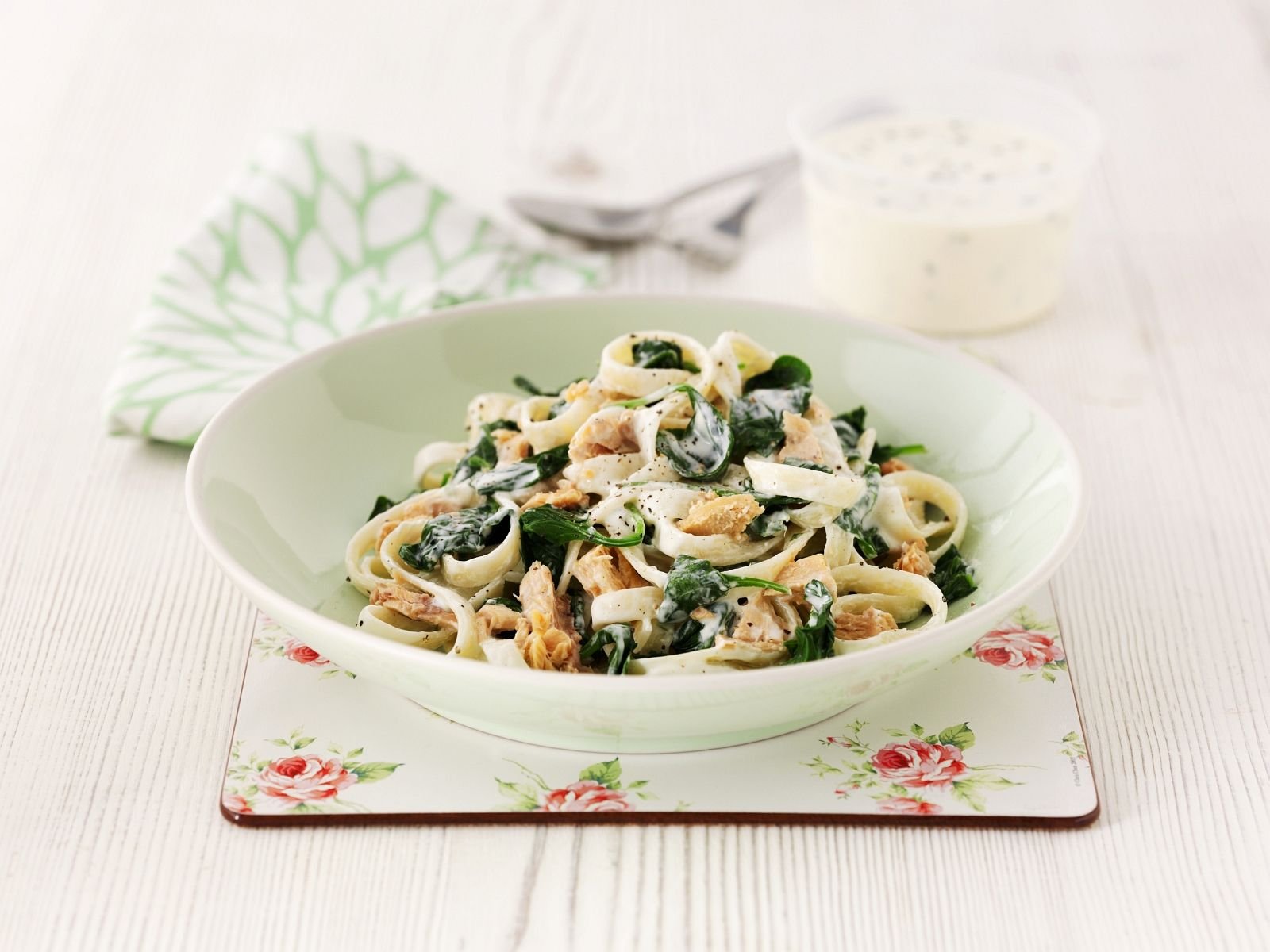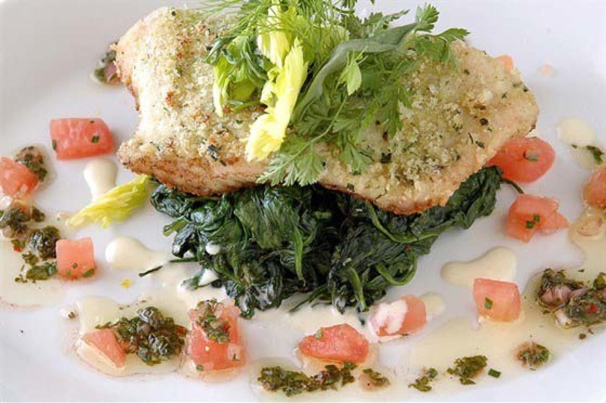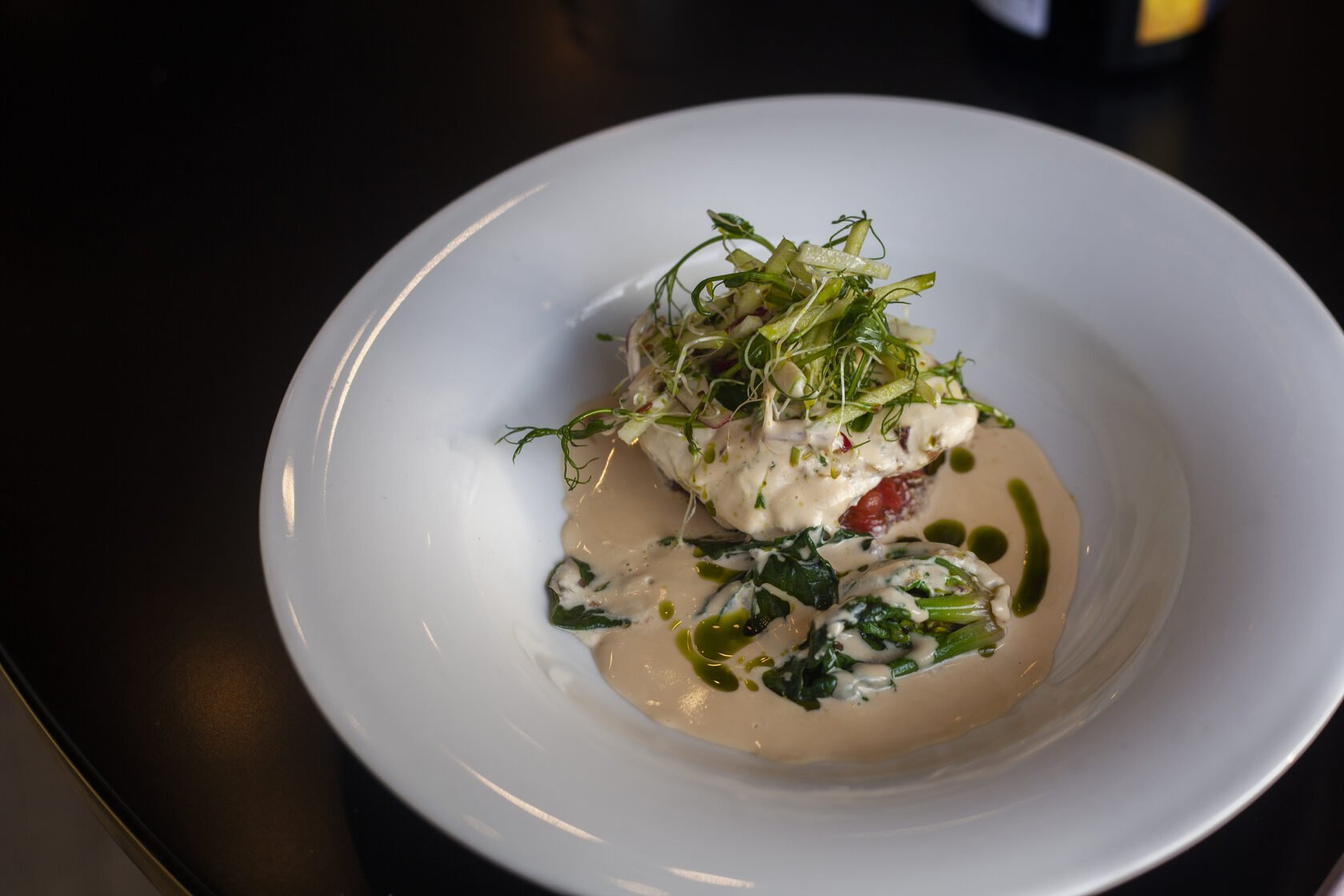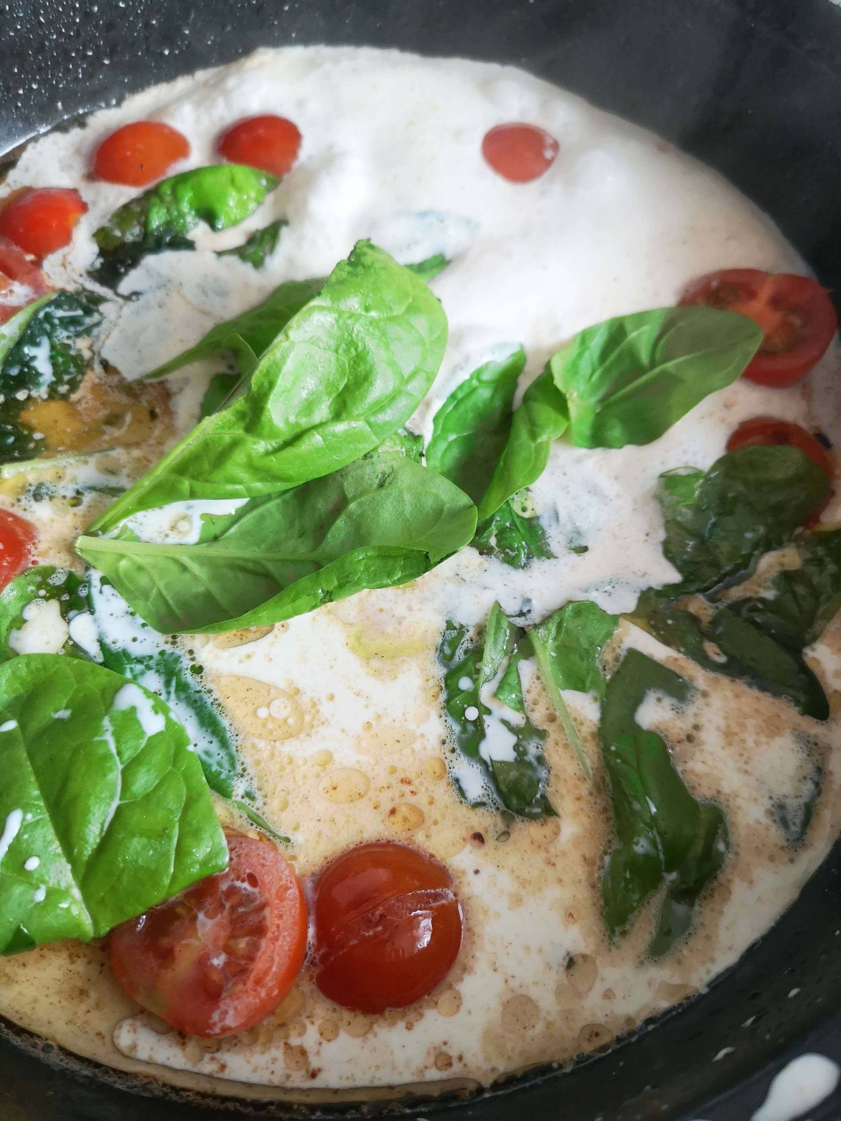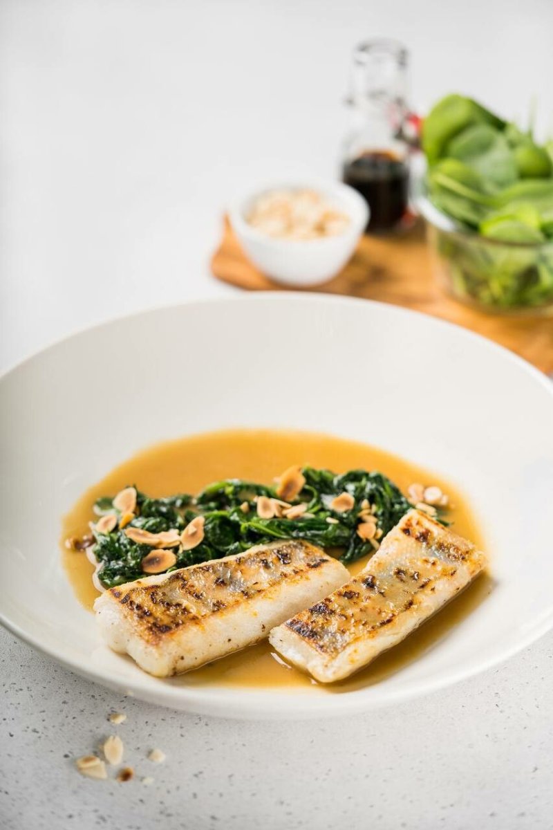 Филе лосося в сливочном соусе со шпинатом и грибами